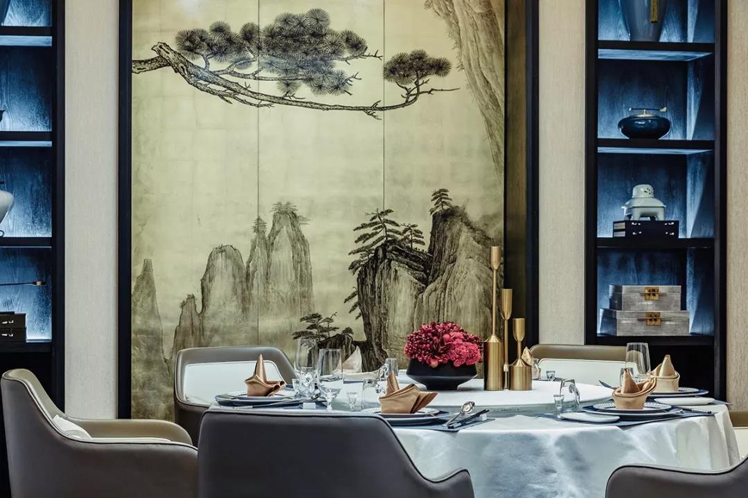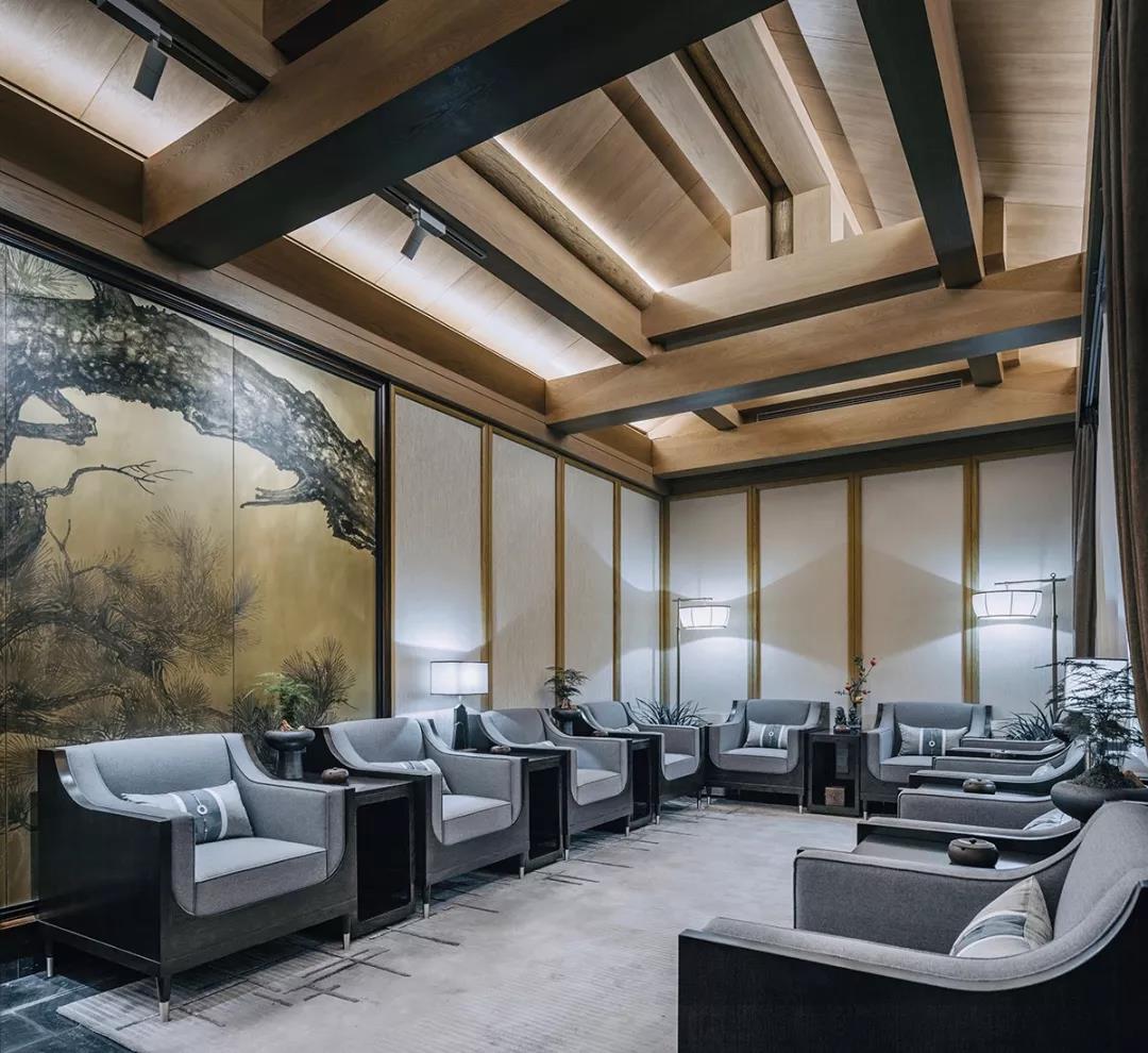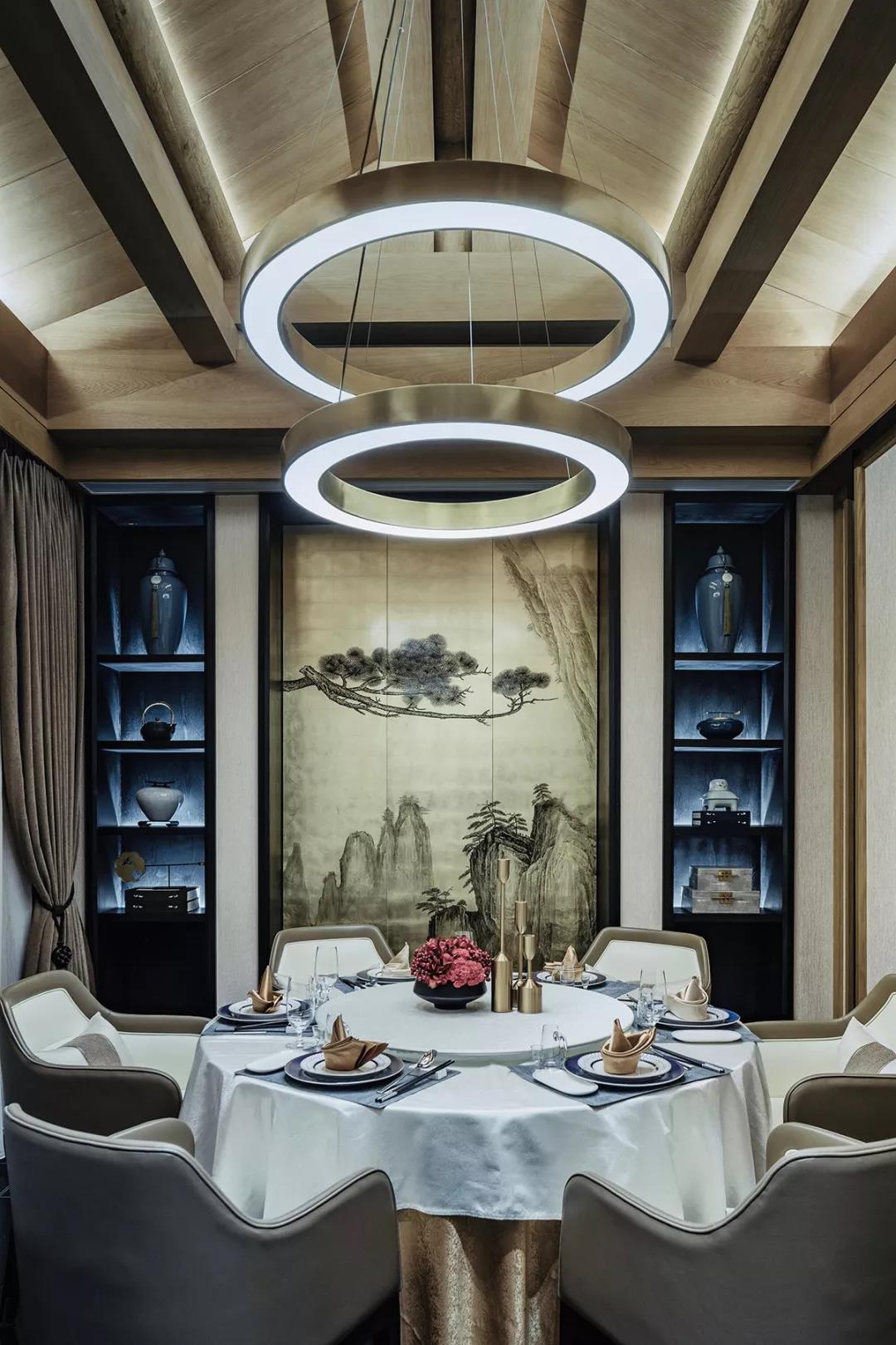 山水林間,云霧繚繞背景墻的營造,不同元素之間的相互重組融合,以此帶來更加融合新中式的庭院風(fēng)采,室內(nèi)和室外的設(shè)計(jì)元素的運(yùn)用相互貫通,保留著新中式住宅的神韻和精髓。