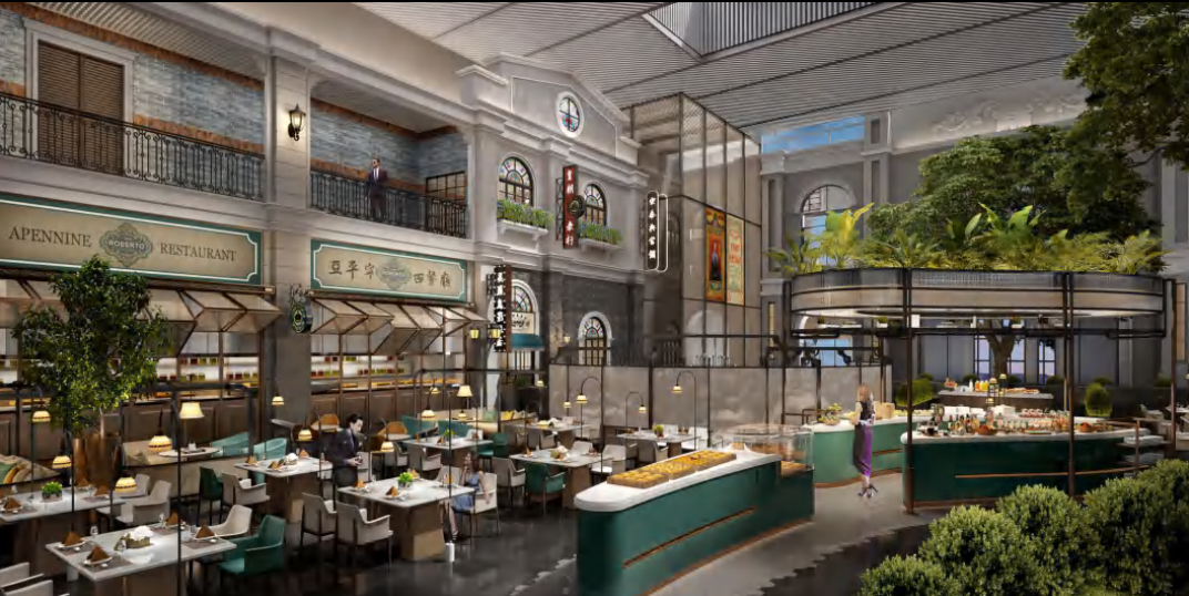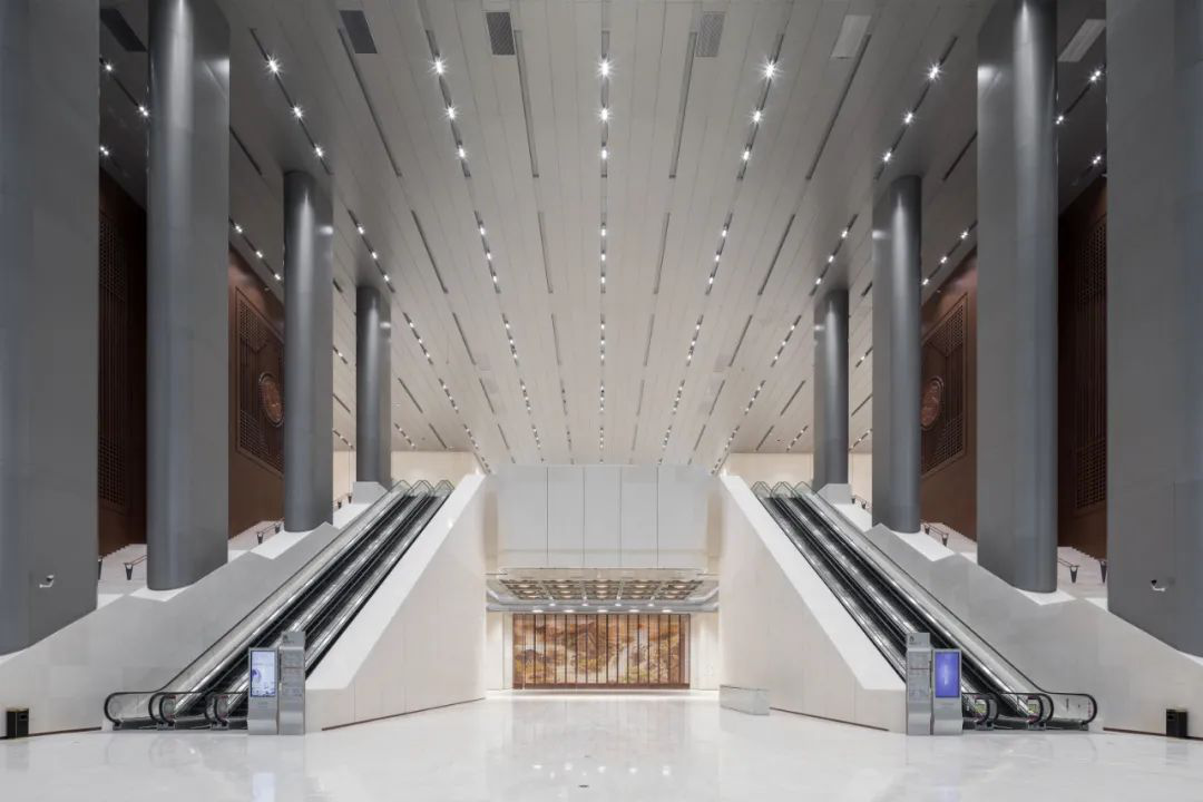 空間地面、立面中各類臺階及柱子,挑空護欄檐口及墻面的各類結構體塊以米色石材圓潤規(guī)整的手法整合,西大廳主立面利用柱跨及疊級進退結構墻體設計,象征大國對外開啟的“門”,古銅質感,造型圓潤,細節(jié)豐富,尺度震撼,以寓意賓客盈門。
