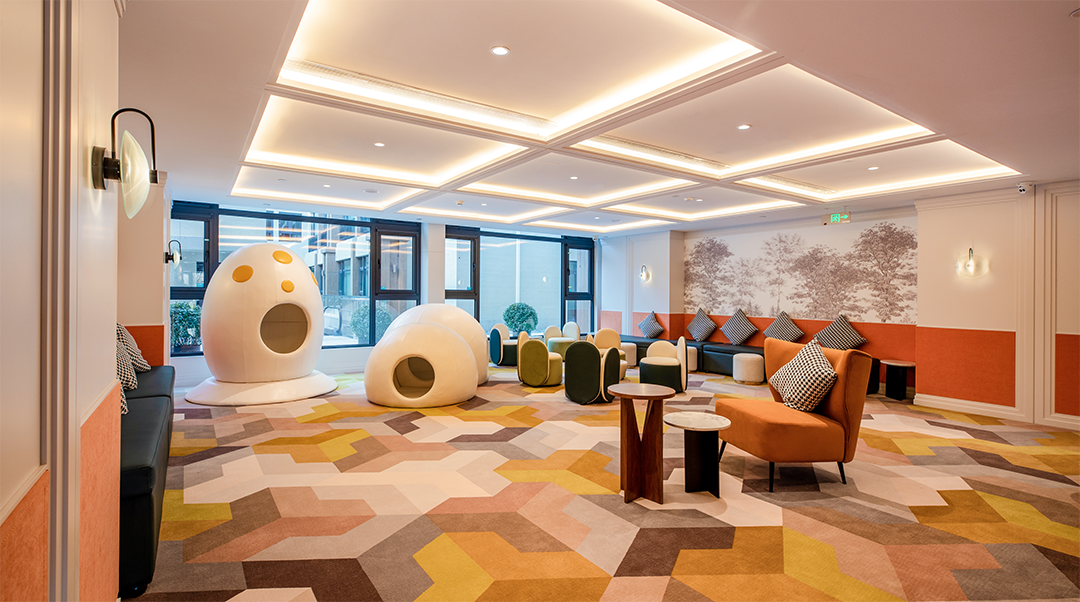 親子區(qū)域采用了橙色與藍色的撞色搭配,即明亮歡樂又童趣活潑。