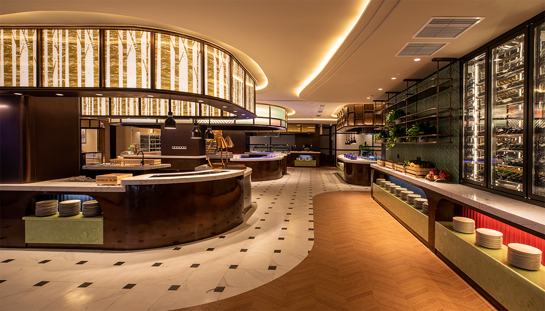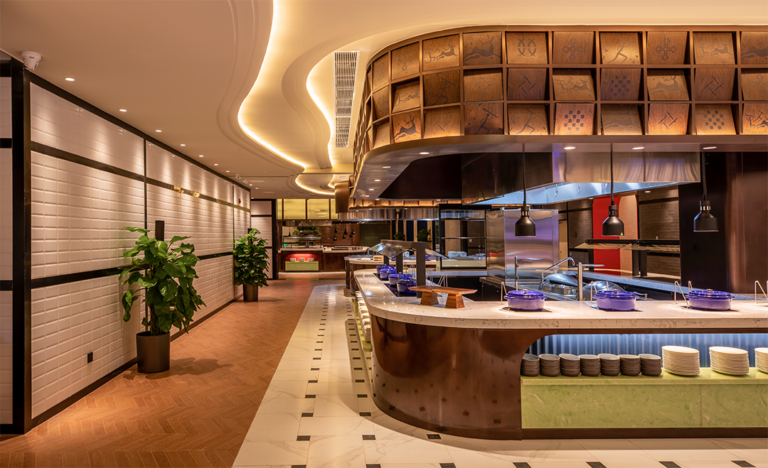 取餐區(qū)采用了當?shù)刂陌诉_嶺長城的元素將他們?nèi)谶M了墻面上。