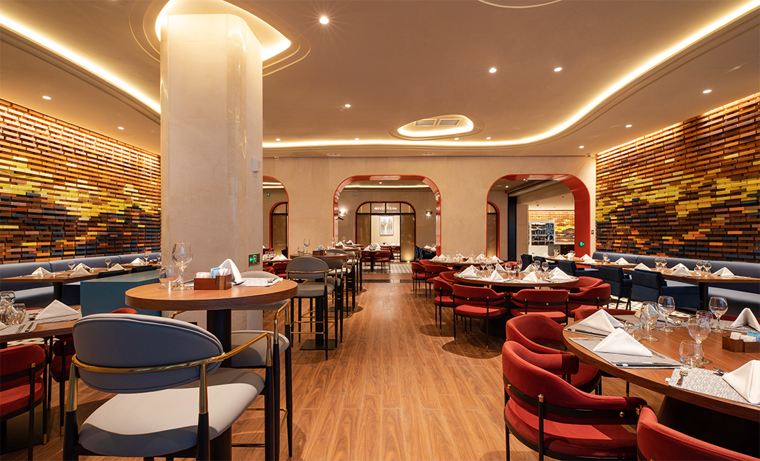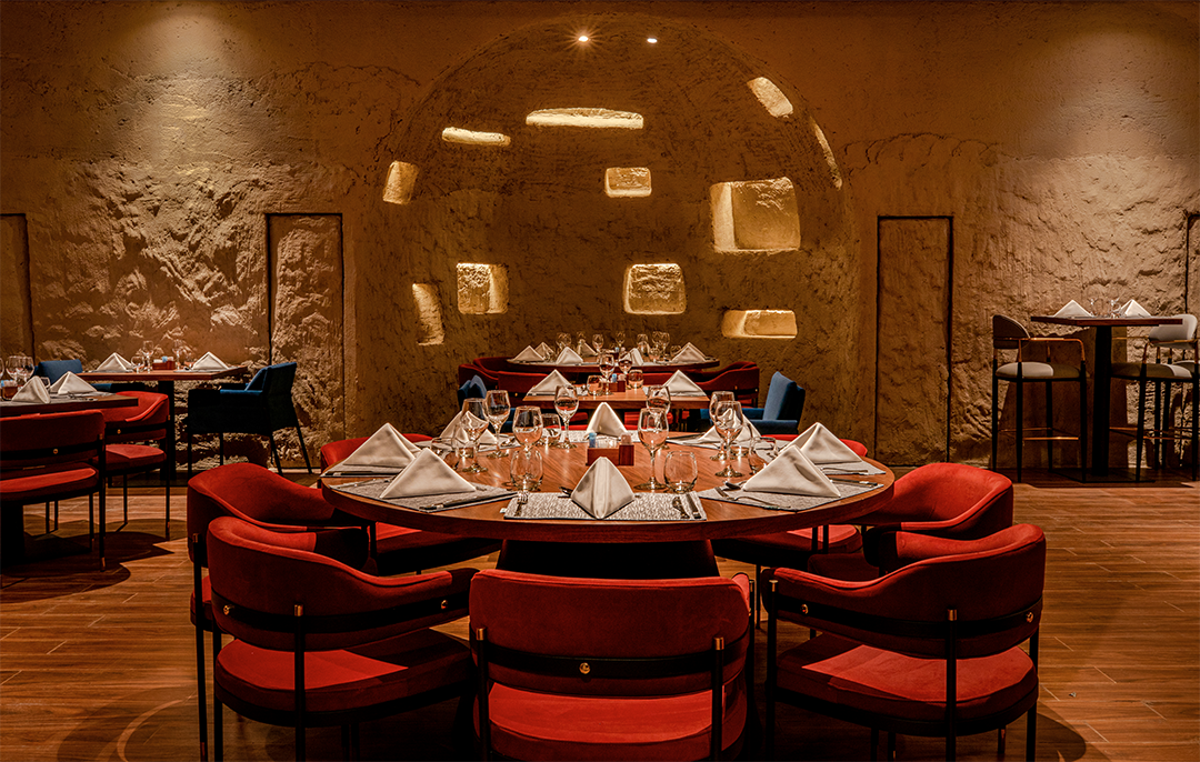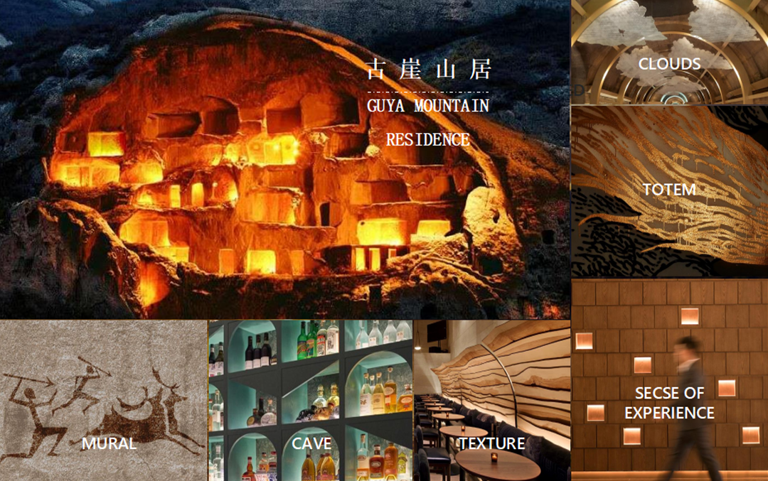 餐廳結合了古崖居的風格,背景的顏色時尚簡約,還原了石洞風貌。