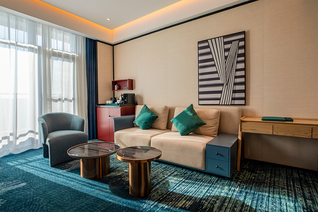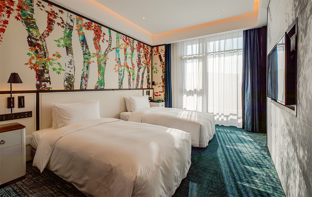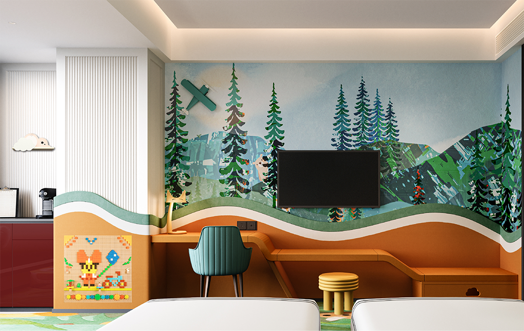 家庭房的壁紙更加活潑童趣,色彩也更加豐富相互碰撞,制造了一個仿佛在外野炊的感覺。無意間出現(xiàn)的藝術品,是對自我的展現(xiàn),亦是品味的體現(xiàn)。