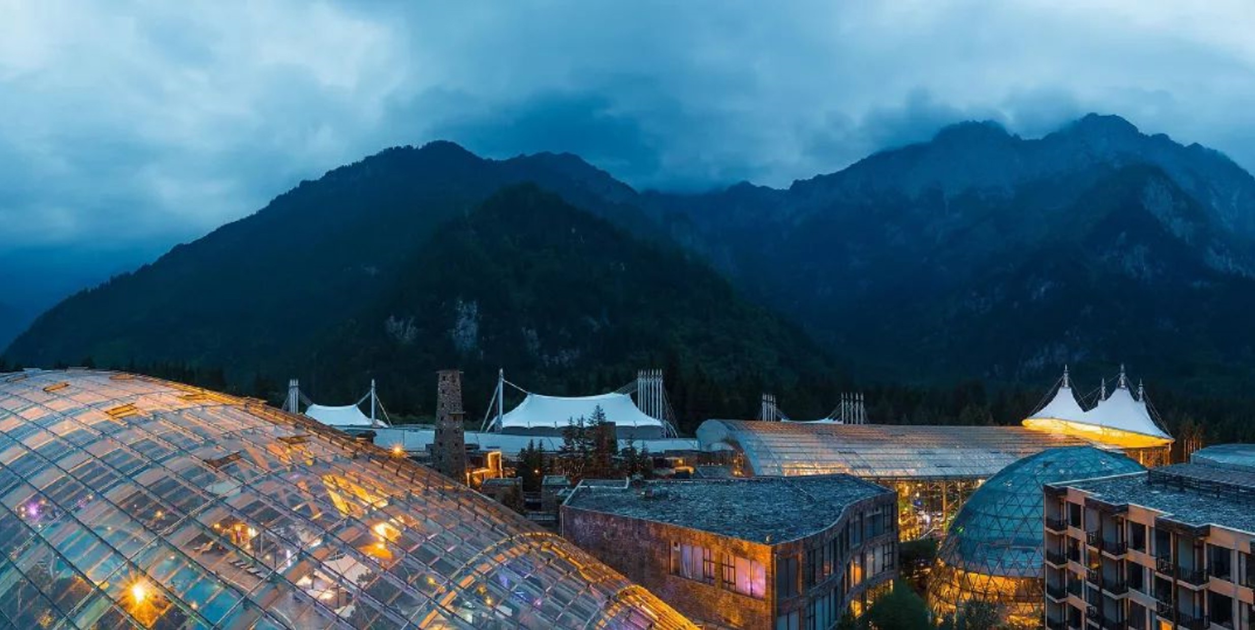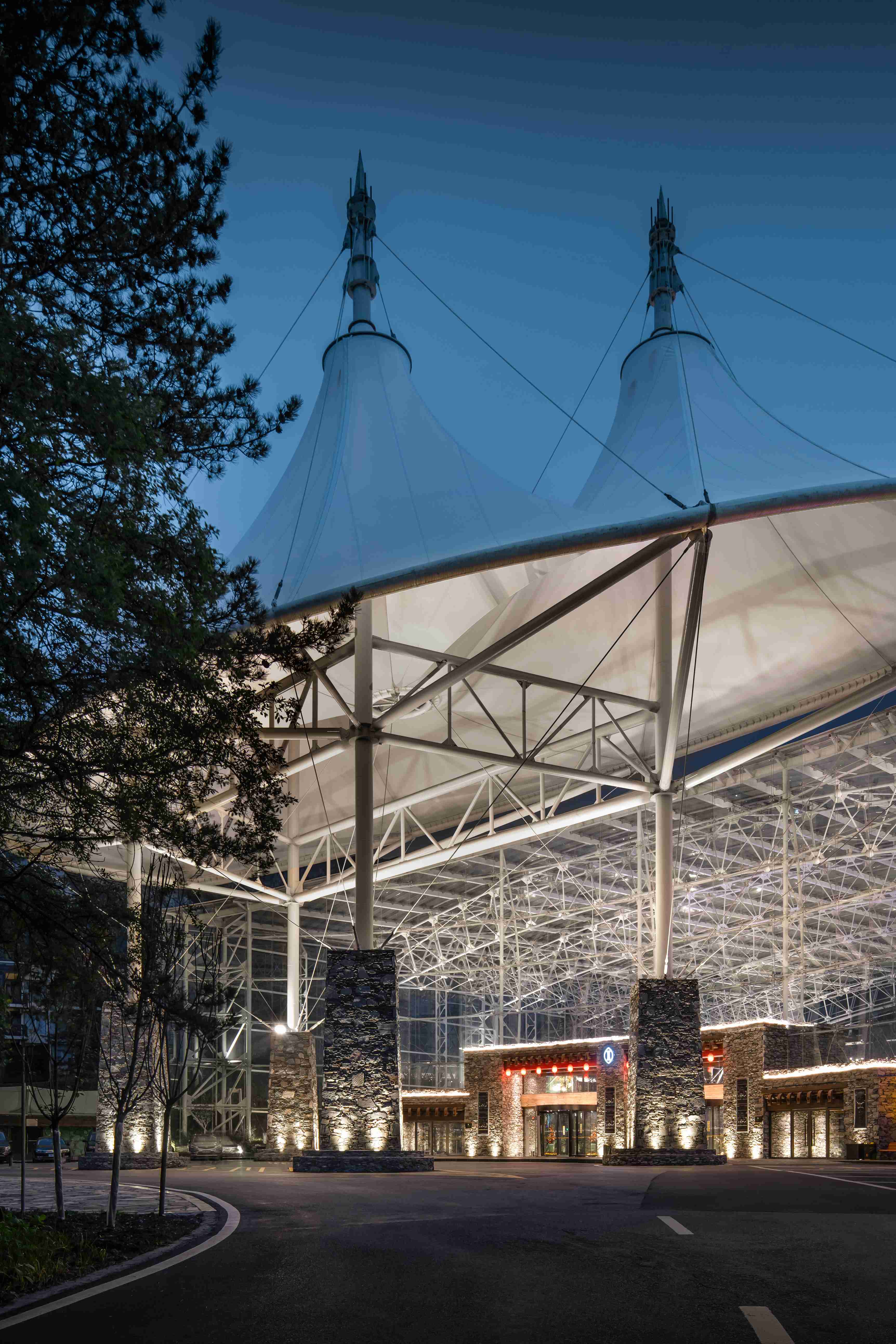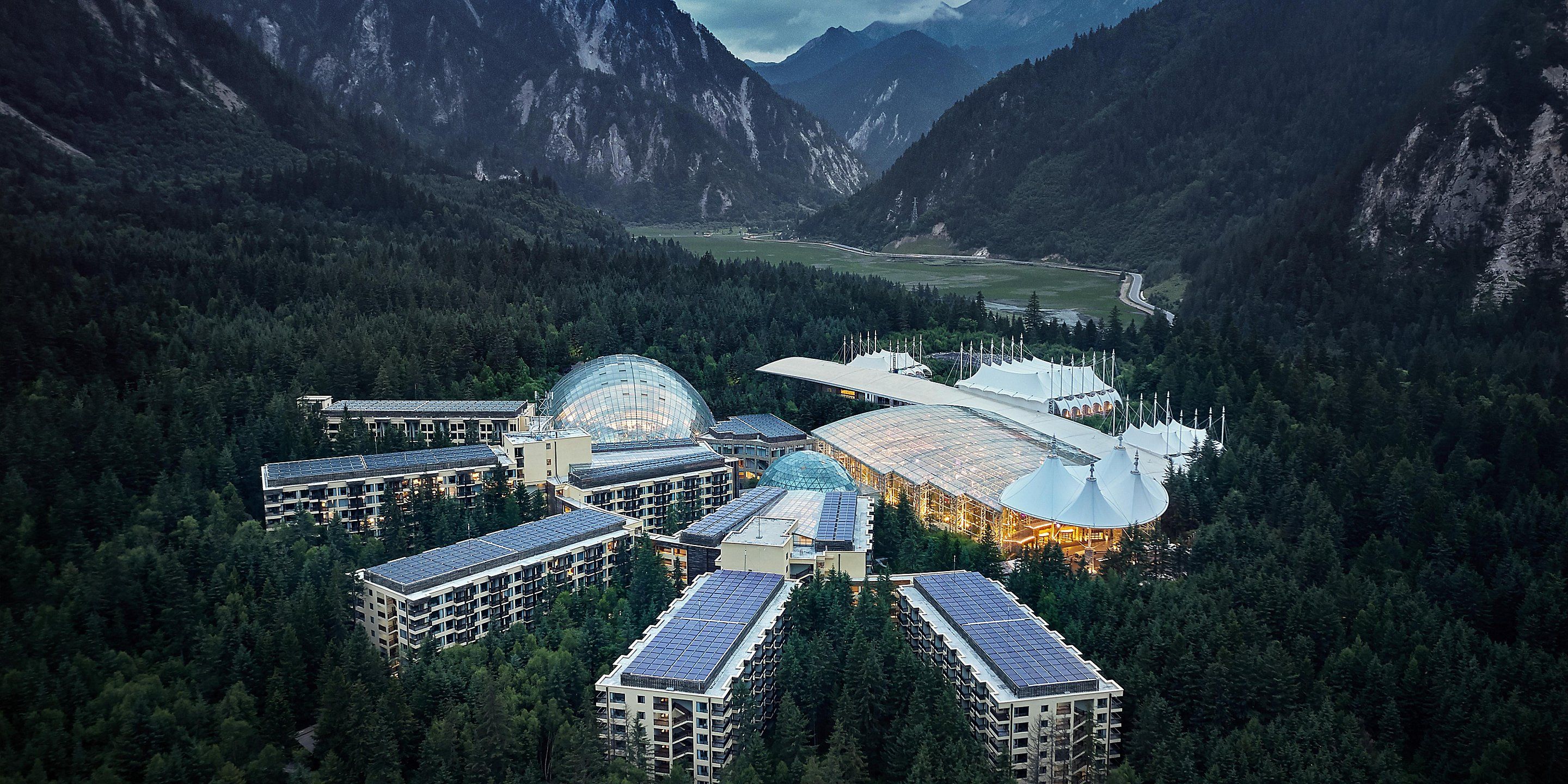建筑群背靠雪山,掩沒于原始森林之中,以群山環(huán)繞、綠樹蔽日、碧水流淌的自然環(huán)境,配置全球一流的、前衛(wèi)的建筑形式,使客人在享受高檔硬件條件的同時,通過被譽為"消失的建筑" Disappeared architecture的透明的全玻璃頂建筑,容身心于藍天白云森林綠樹之間。森林別墅依山傍水,遠瞻皚皚雪山,前眺碧海草甸,自然環(huán)境美妙絕倫。鋼拱架全透明玻璃結構的10000平方米大堂、10000多平方米的溫泉中心、會議中心及各色餐廳、酒吧、古羌寨結合在一起,像一片花瓣,飄落在森林中。(九寨天堂洲際大酒店連續(xù)兩年被評為"中國十大最受歡迎度假酒店",獲"金枕頭"獎,且通過"綠色環(huán)球21"認證的酒店)