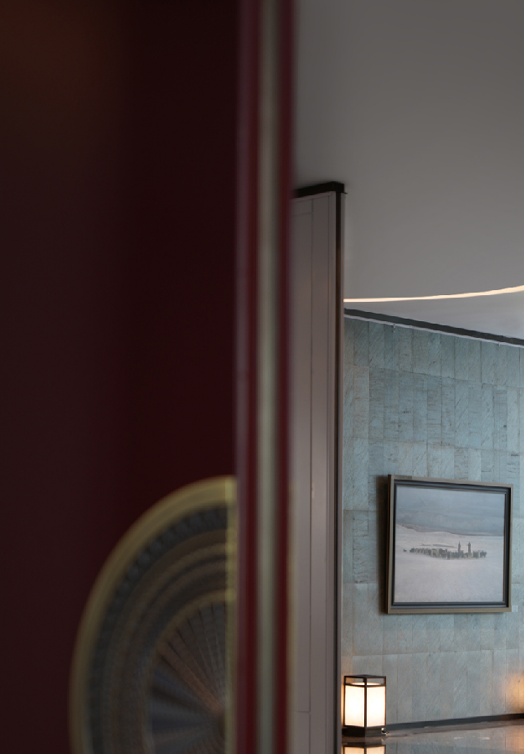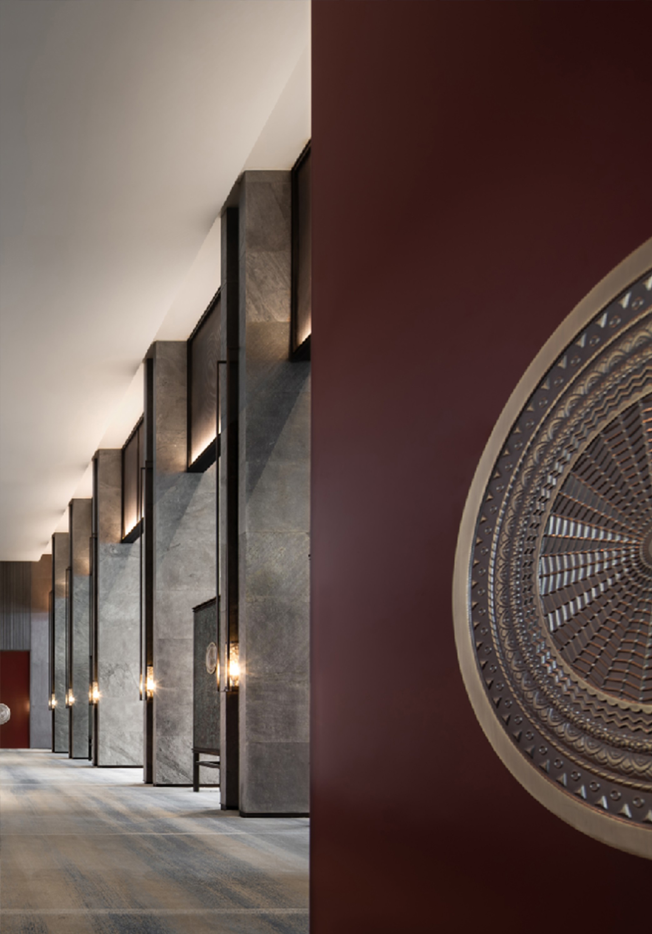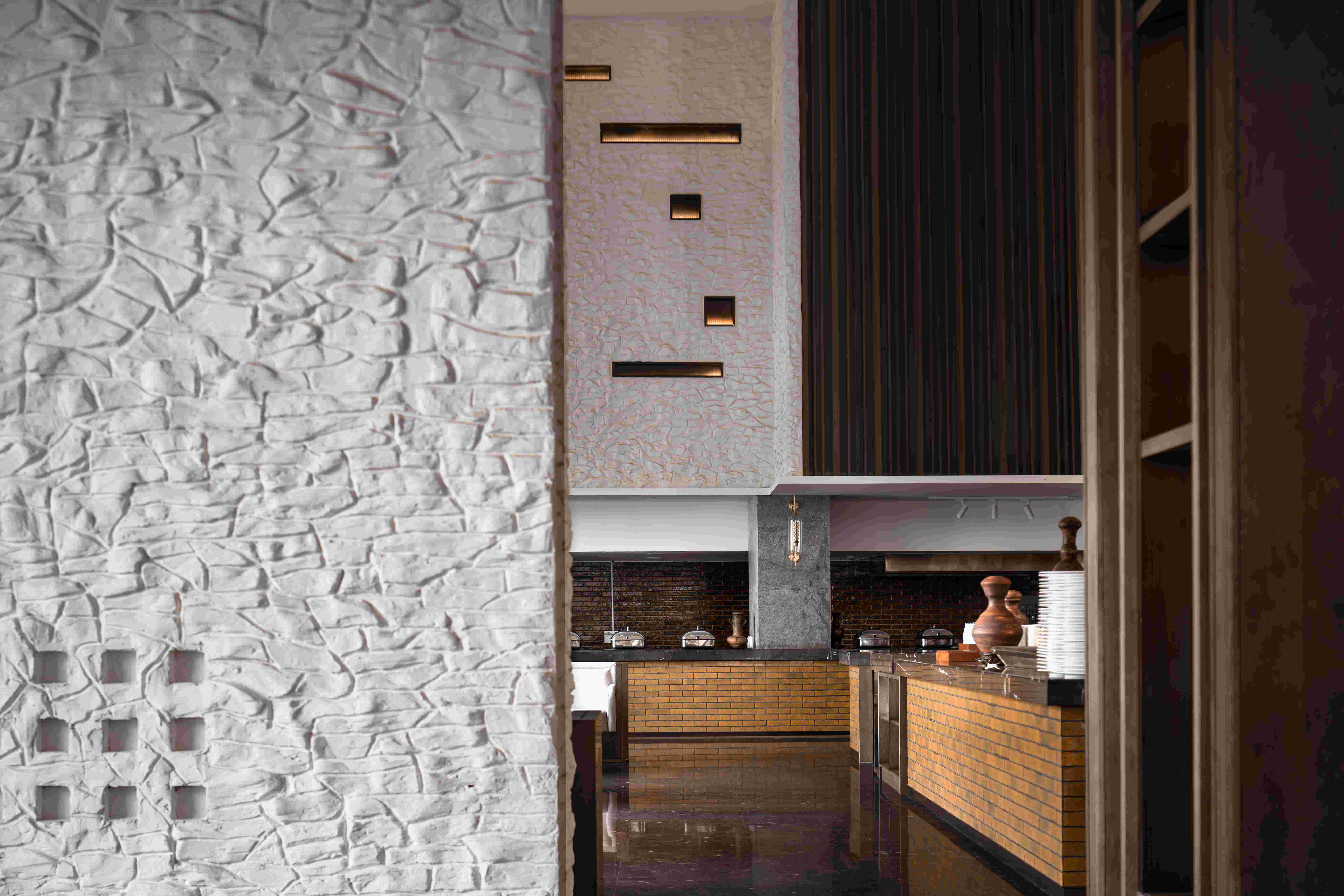 天然質感薄石材墻營造空間序列感。