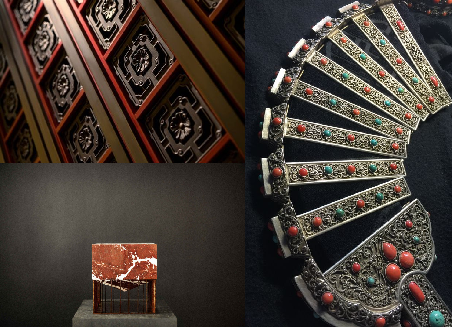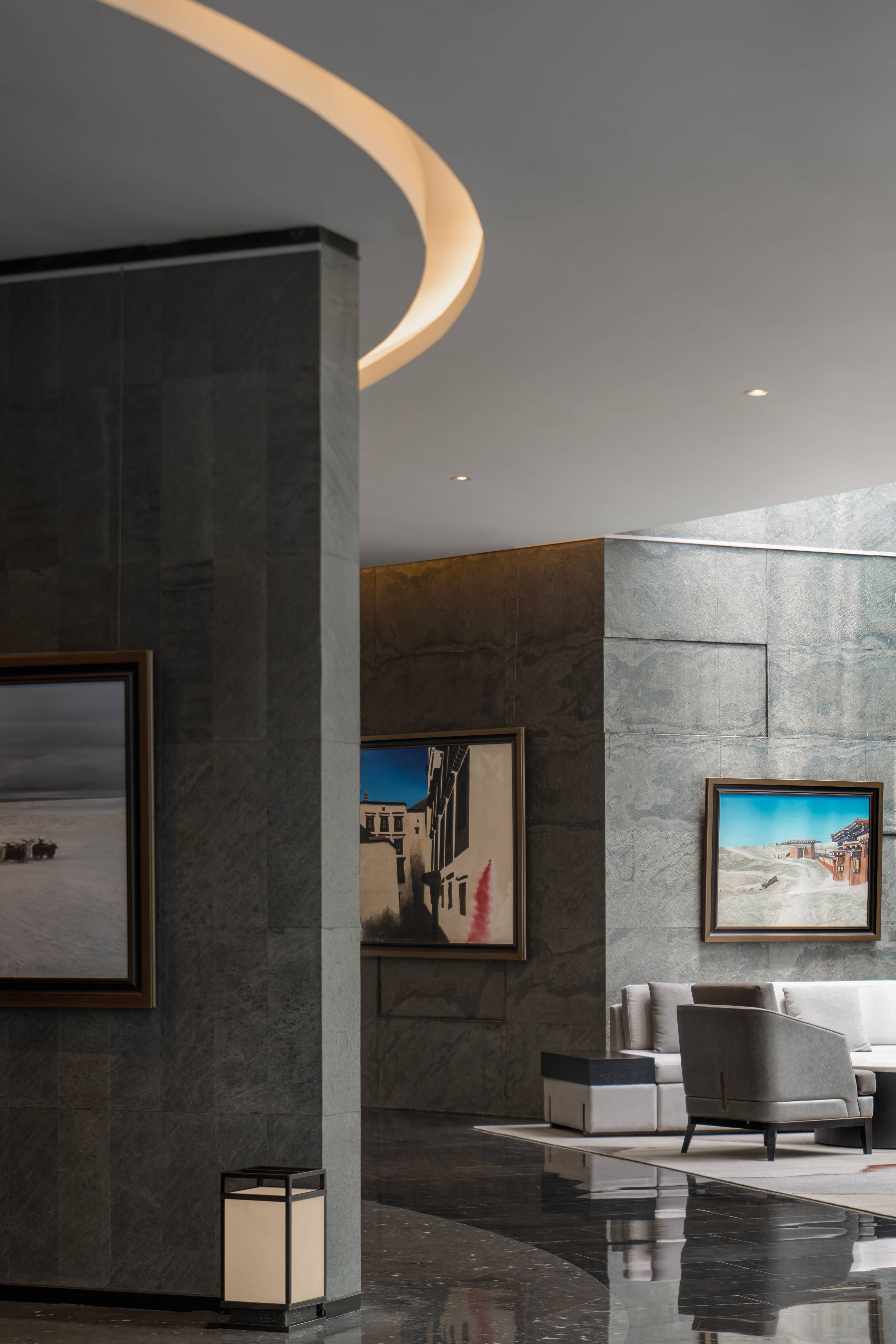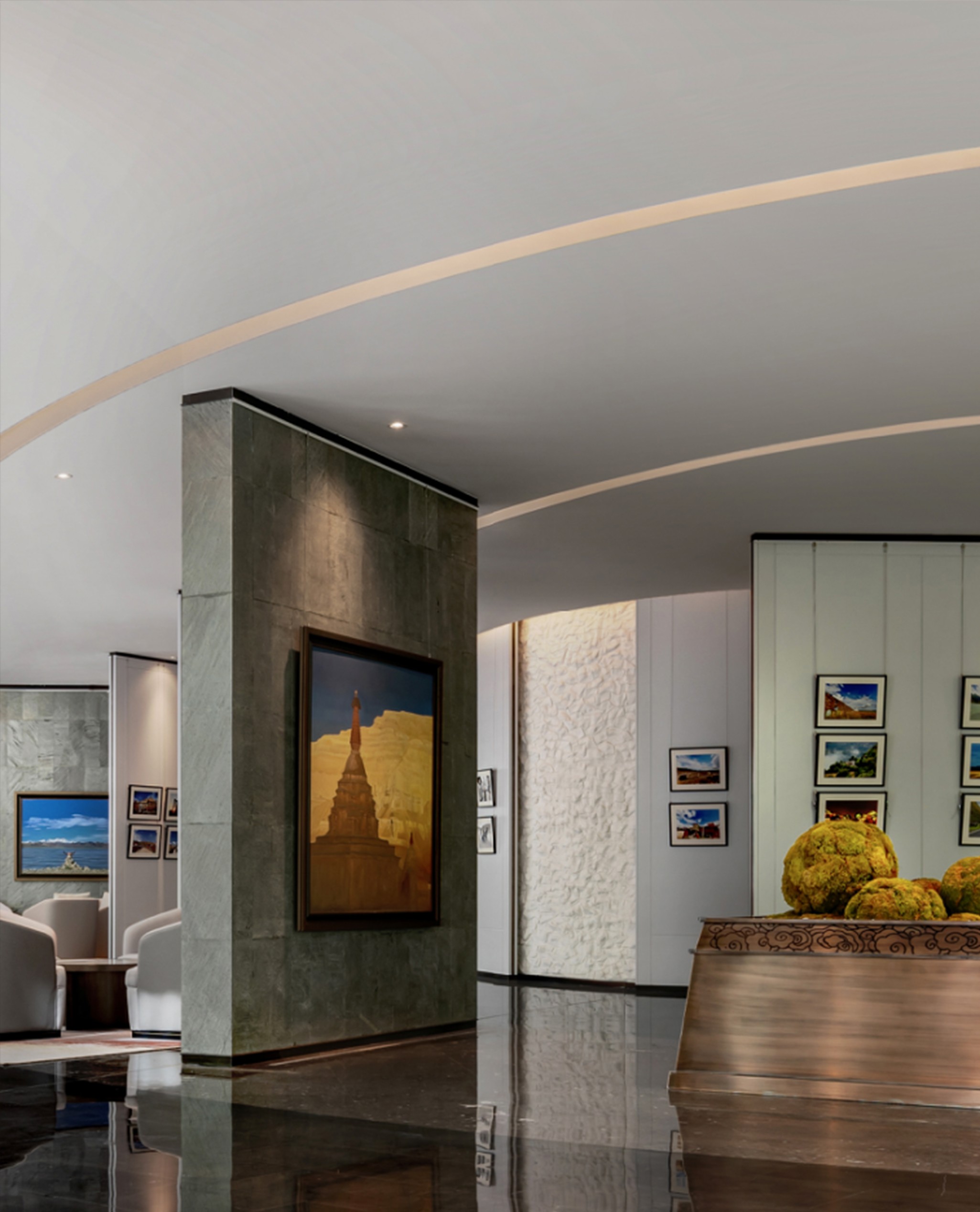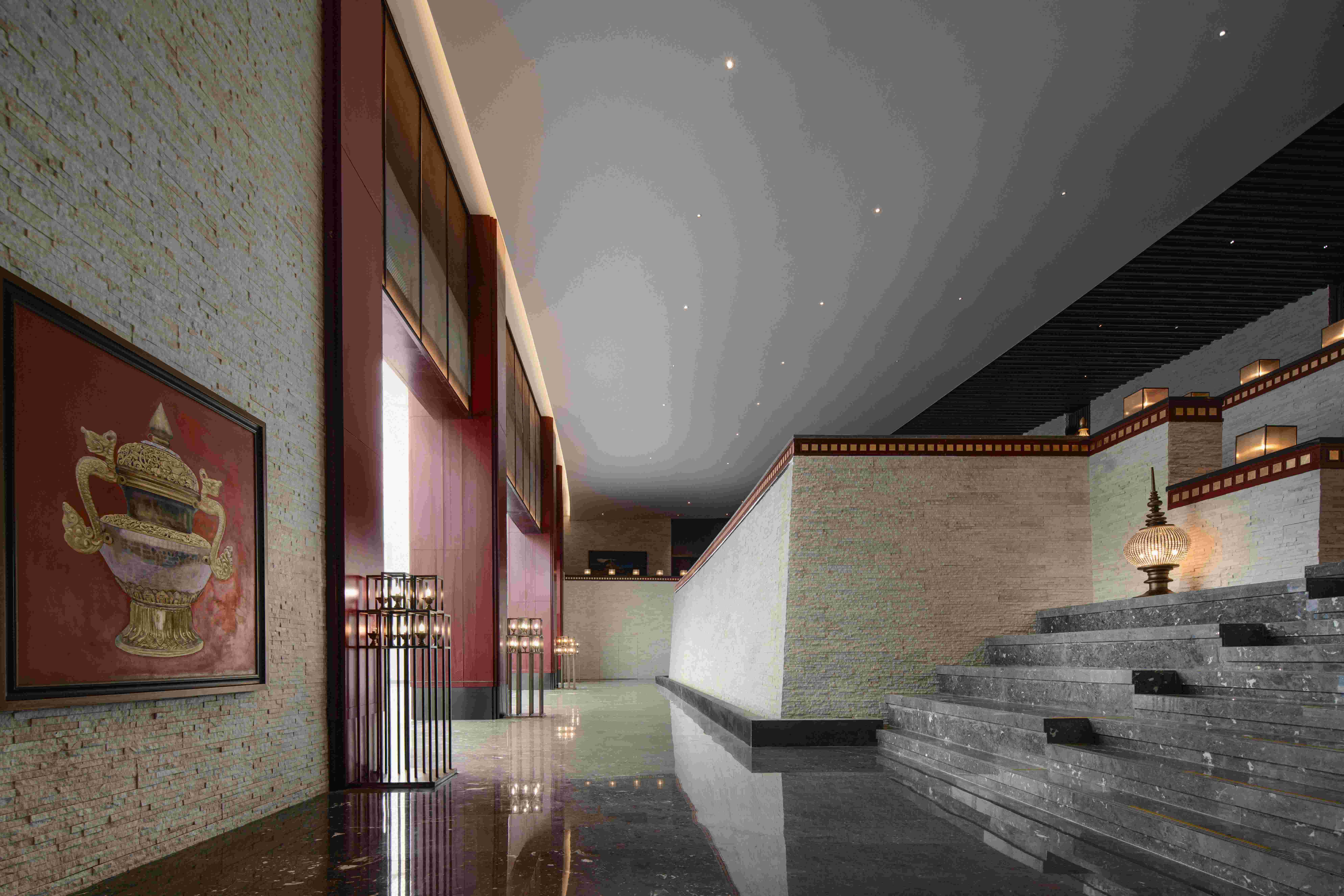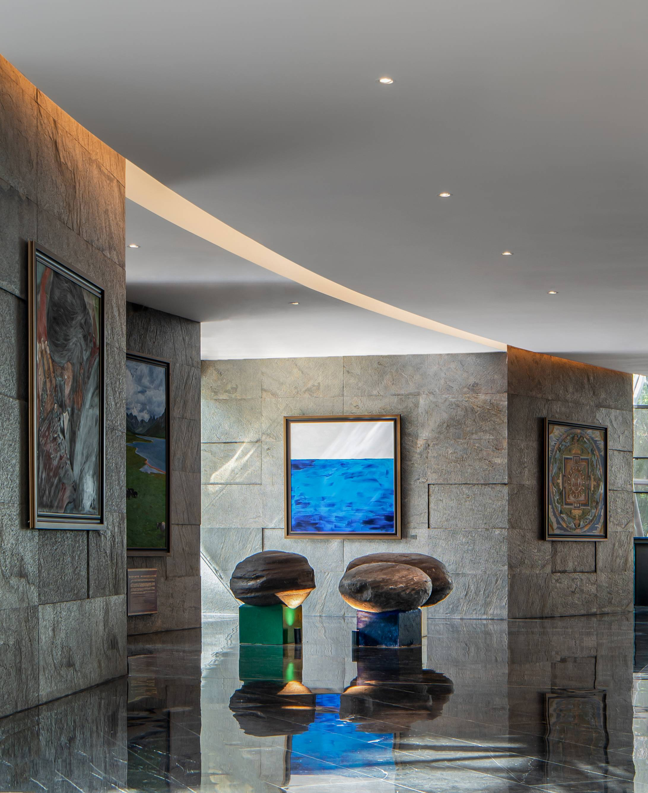 天然質感薄石材墻、藏式邊瑪墻融合藝術畫廊。