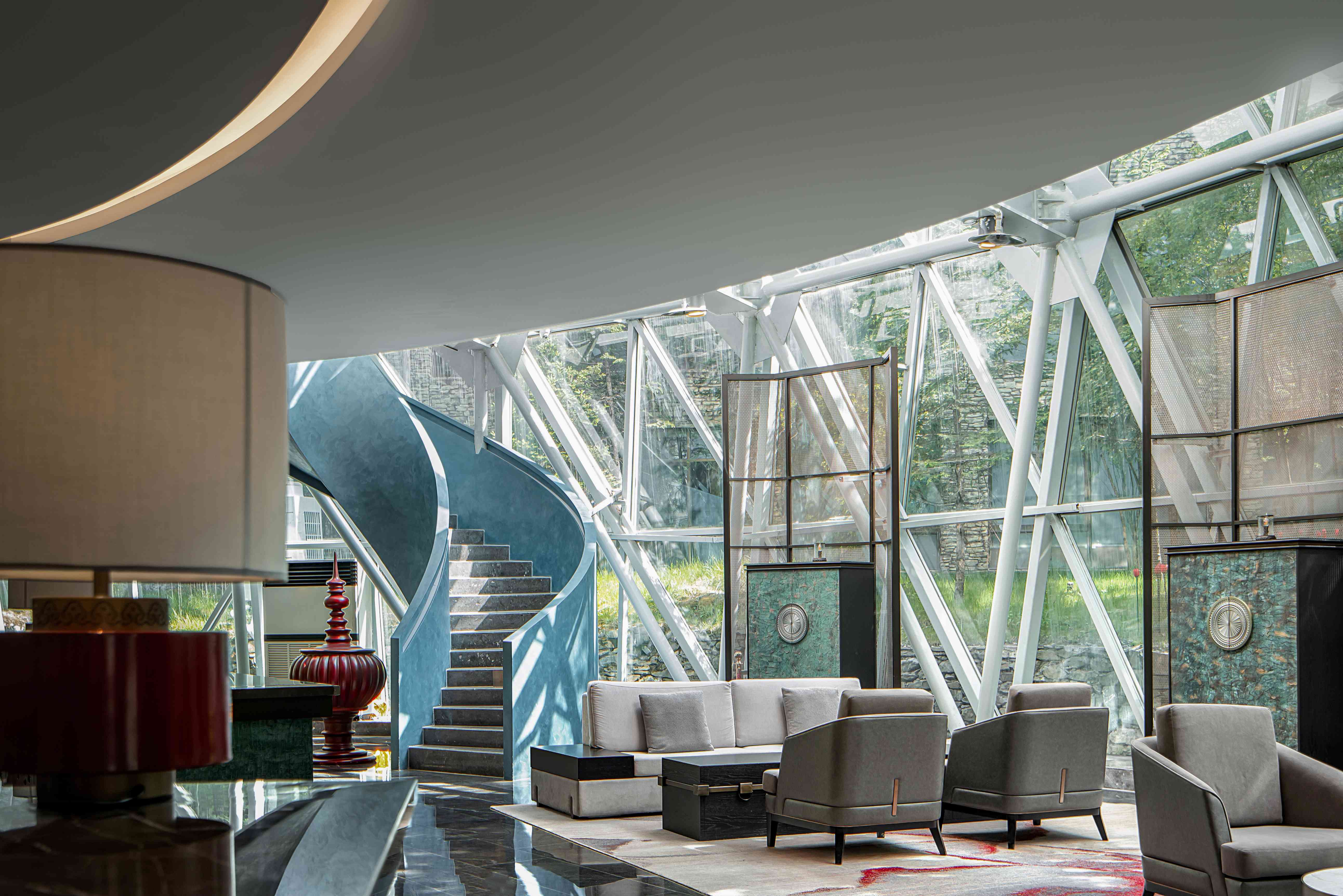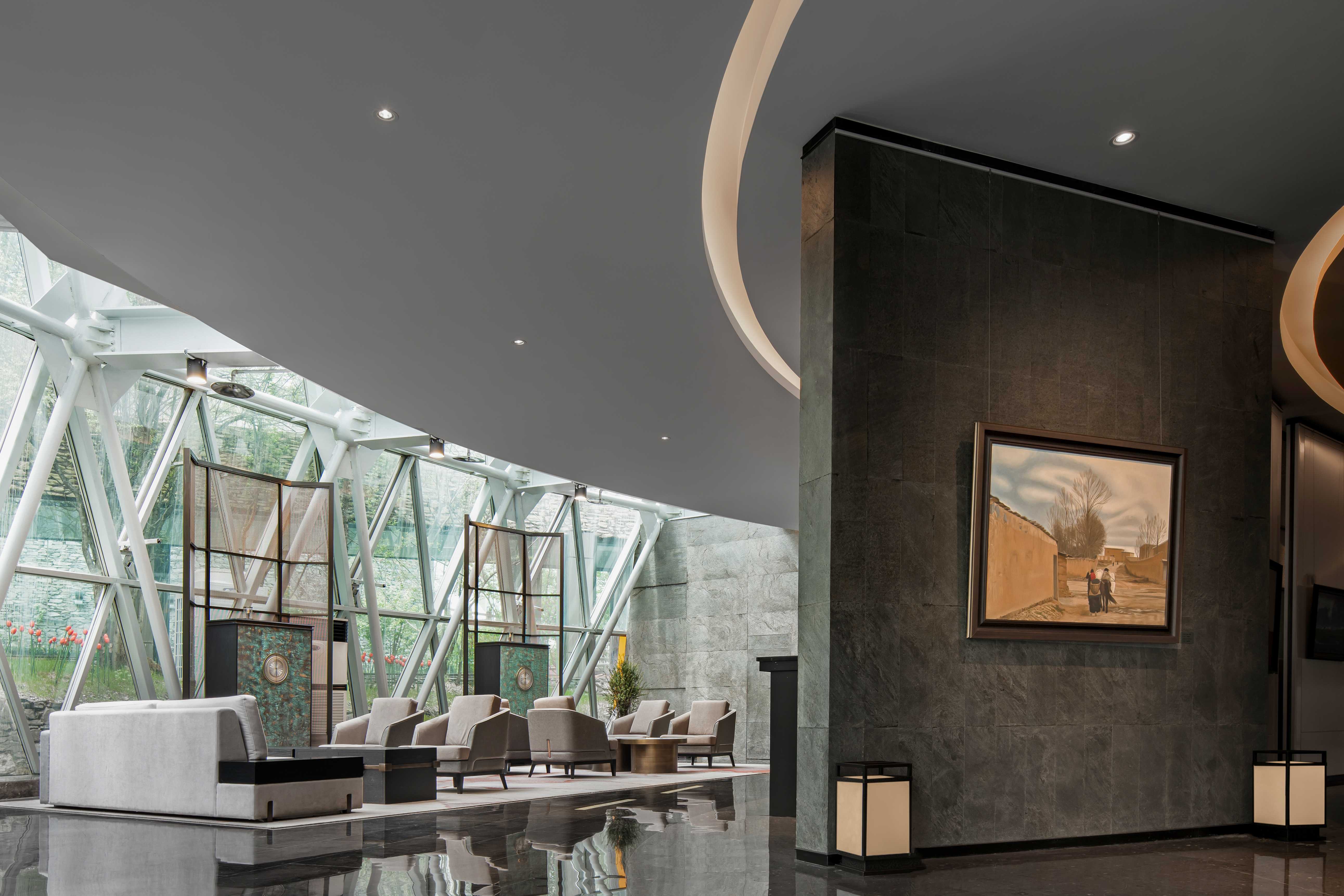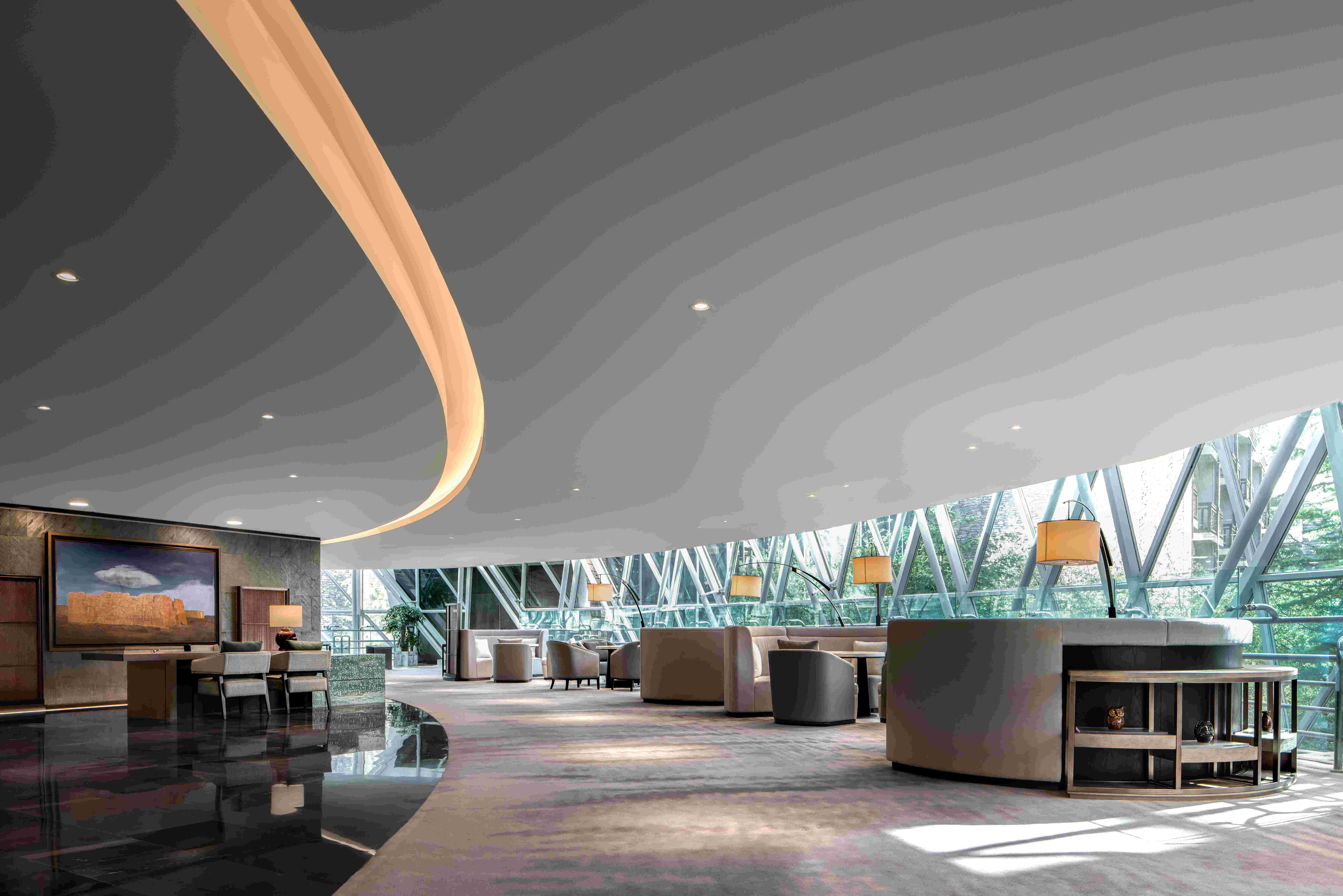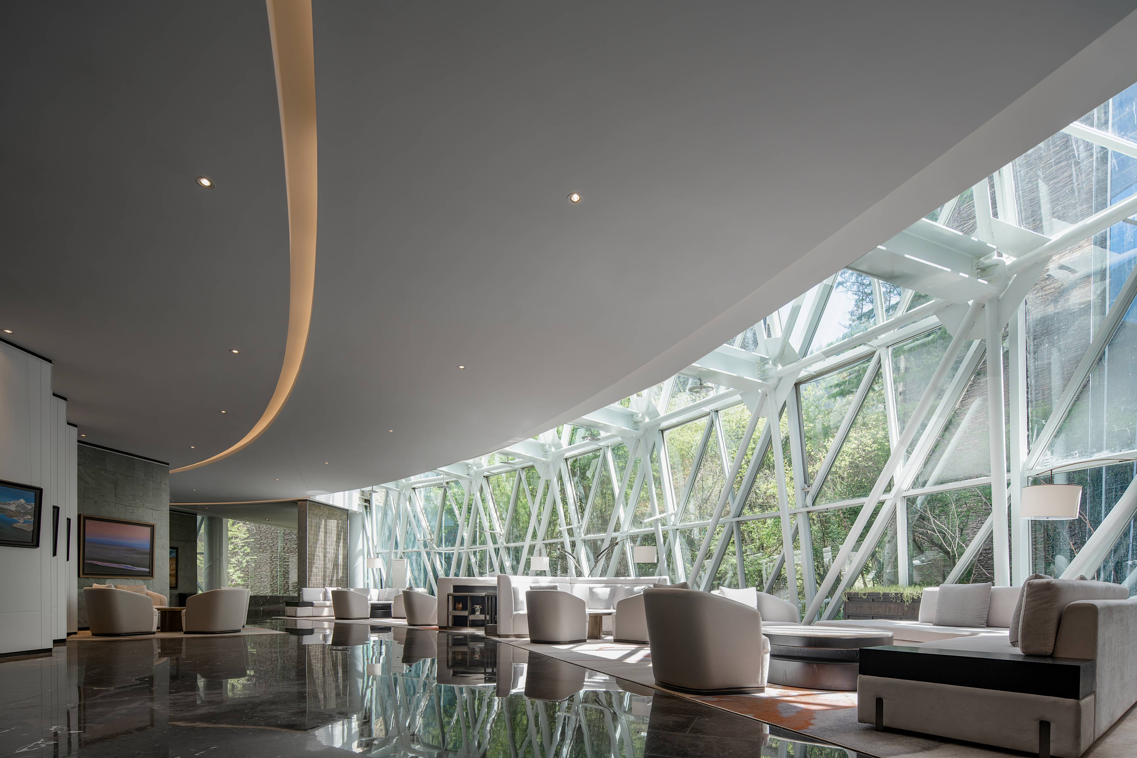 大堂休息區(qū)布置在景色最好的區(qū)域,這里被自然森林所環(huán)抱,不同的時節(jié)可感受不同的風景。