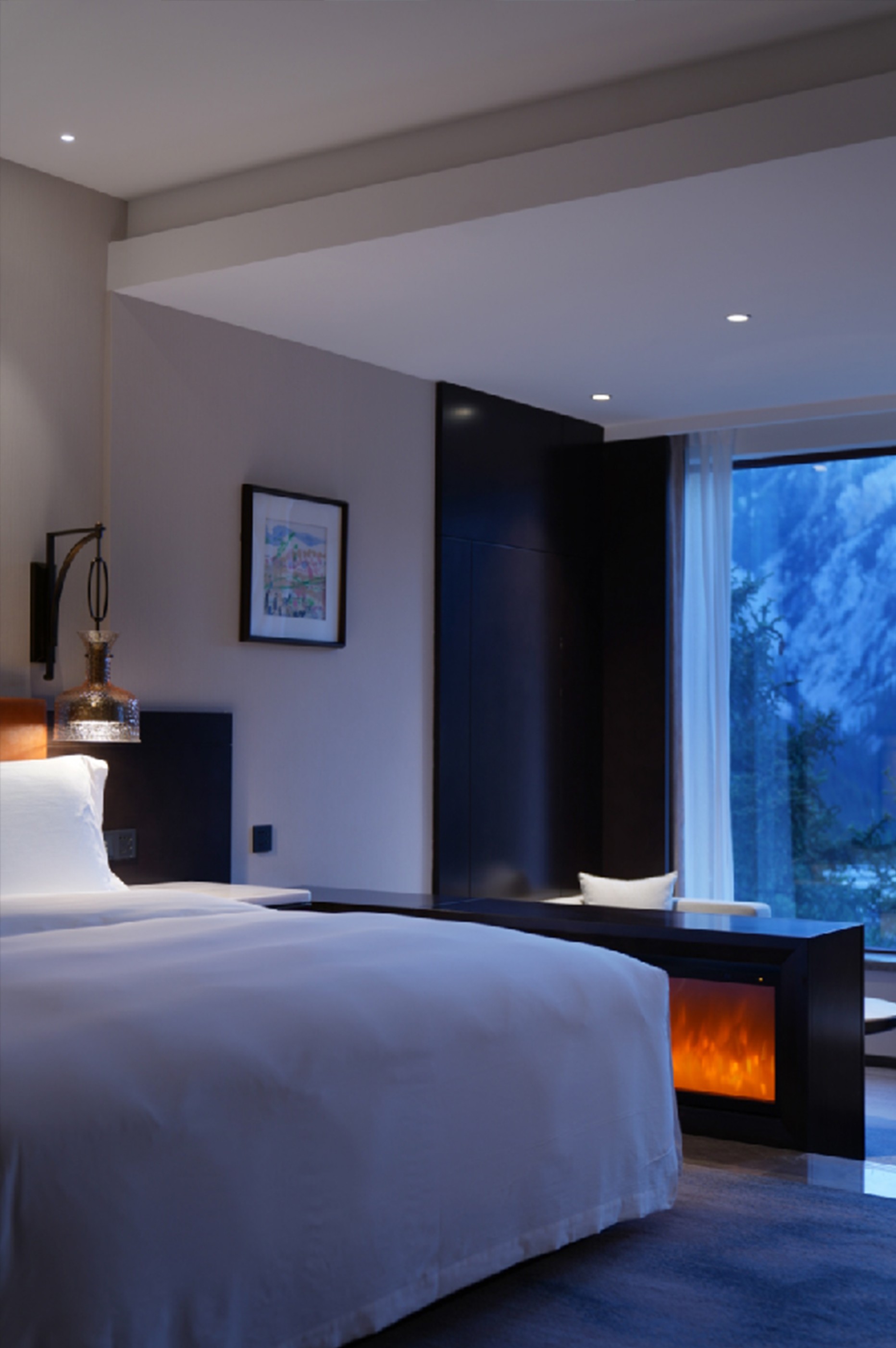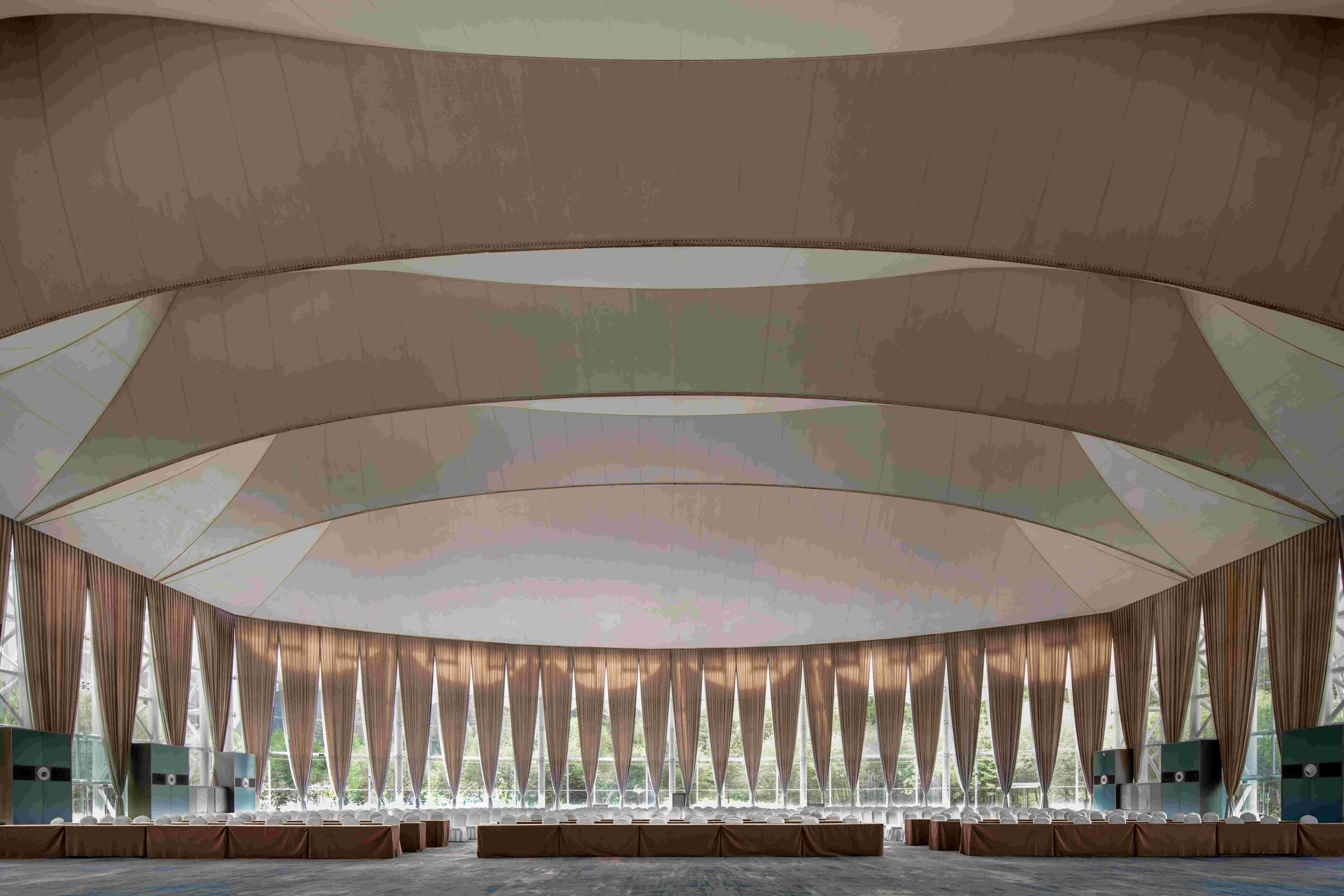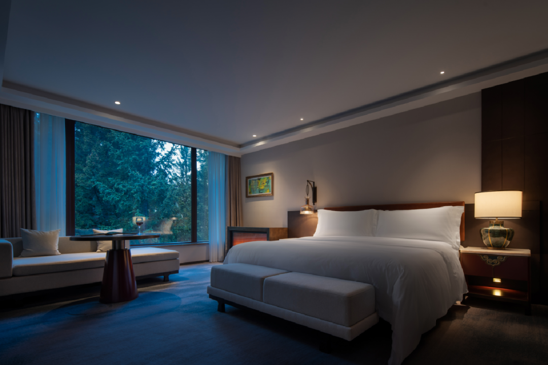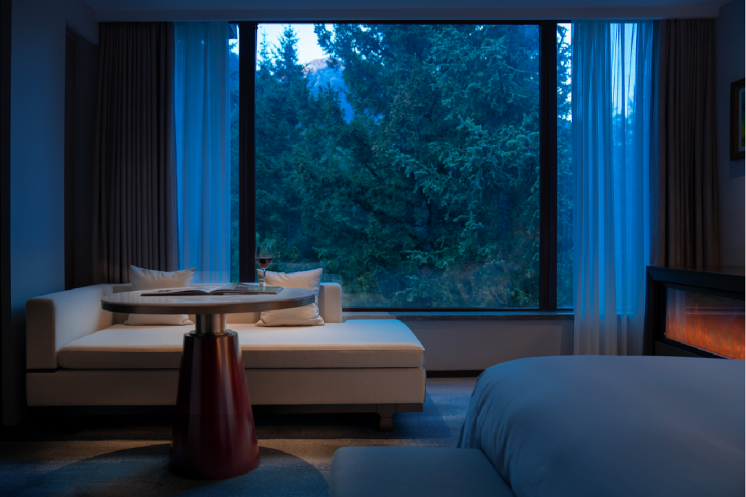 大堂休息區(qū)布置在景色最好的區(qū)域,這里被自然森林所環(huán)抱,不同的時節(jié)可感受不同的風景。