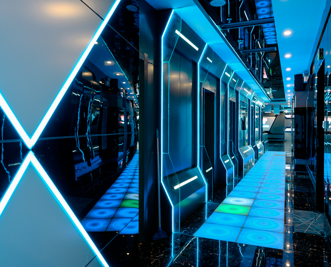 The application of mirror, light reflection and extension effect and a ring aisle finally create a large and closed time tunnel. Such a special design way enables people traveling through there to experience a virtual world and the special charm of electronic sports.