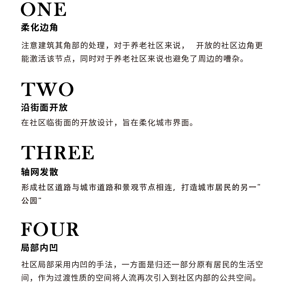 無(wú)障礙設(shè)計(jì)創(chuàng)造安全的生活環(huán)境。合理的步行環(huán)境與休憩設(shè)施營(yíng)造安全的室外活動(dòng)環(huán)境。養(yǎng)老院為自理老人提供“互助”服務(wù),協(xié)助獨(dú)立生活。為介助老人提供提供全天候生活與健康協(xié)助服務(wù)。為失能失智老人提供介護(hù)和康復(fù)醫(yī)療服務(wù)。健康管理為所有老人提供健康管理與疾病預(yù)防。