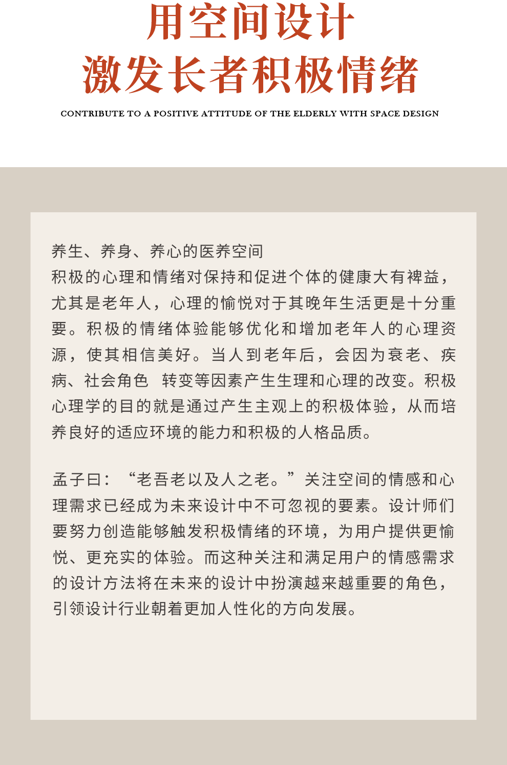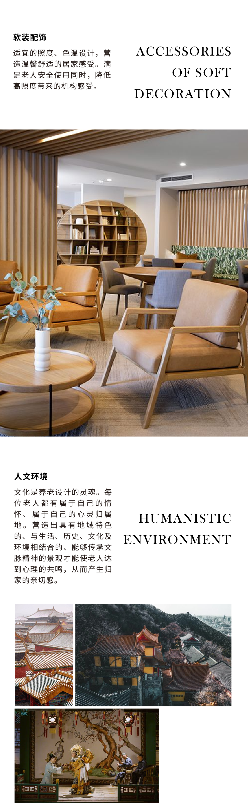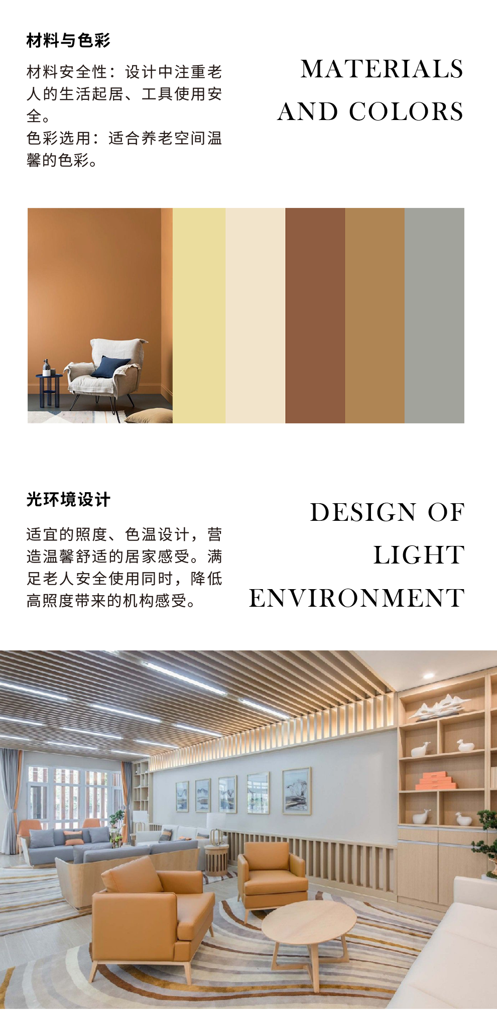 重視環(huán)境心理學(xué)在設(shè)計(jì)中的運(yùn)用,通過(guò)造型、色彩、材料、光環(huán)境及陳設(shè)等手段、致力于創(chuàng)造適合老年人需求的舒適、溫暖的生活環(huán)境。