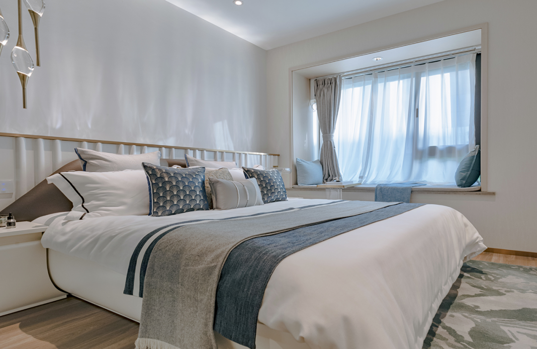 整個空間以藍色為主題,通過柔軟觸感的織物沙發(fā)、床品來柔軟藍色的冷調,通過銀色的飾品,水晶燈的裝點,實木的溫潤觸感,都讓整個空間既有優(yōu)雅的紳士品味,同時也兼具謙謙君子的溫潤如玉的品格。