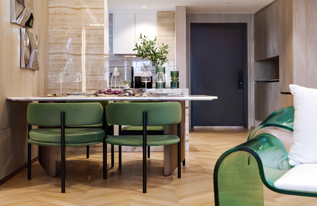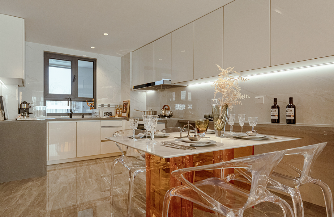 透明水晶餐椅,懸浮式餐桌,還有各色的玻璃器皿,讓餐廚空間視覺上被放大的同時增添現(xiàn)代家居的溫馨藝術就餐氛圍。