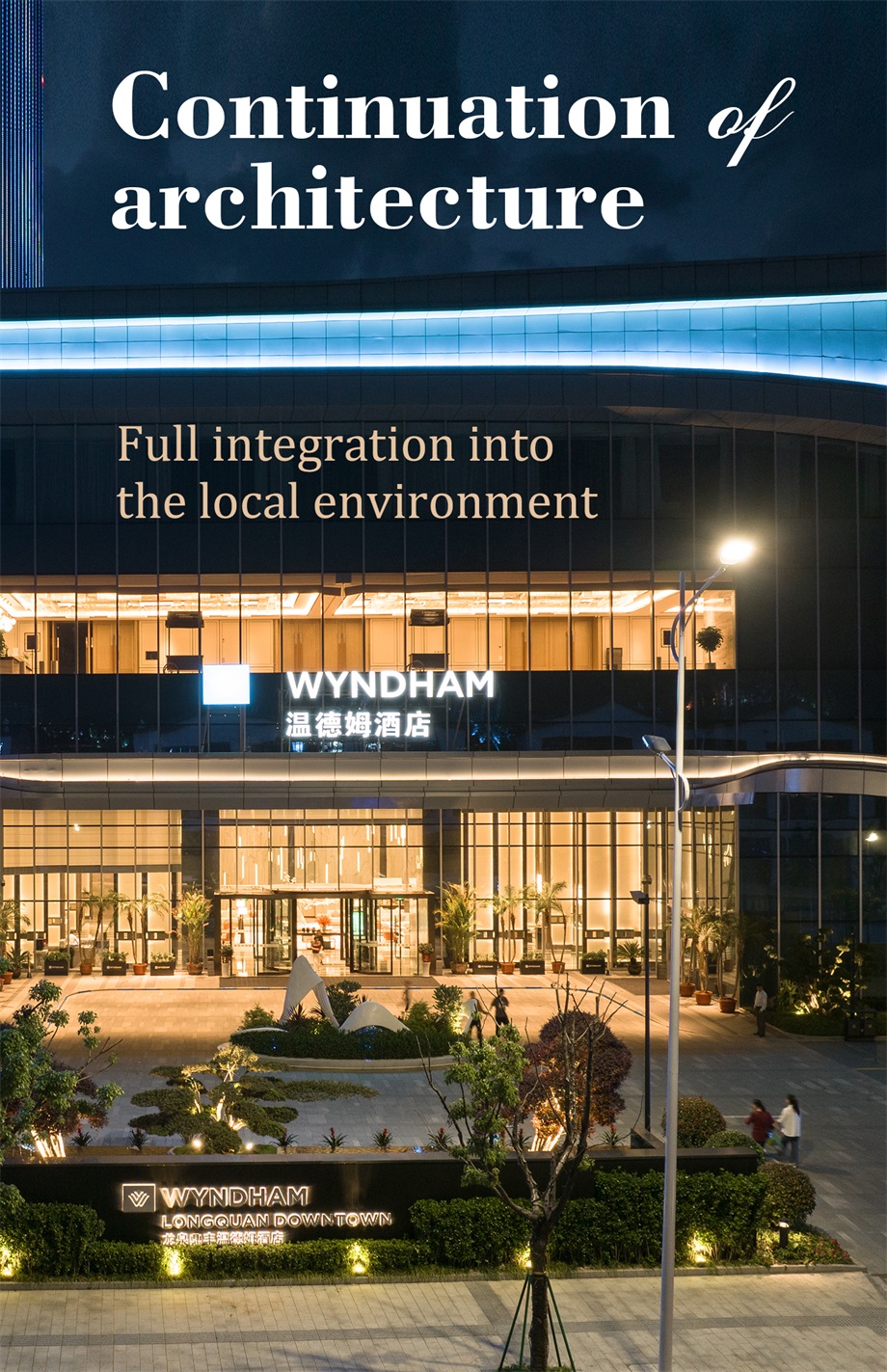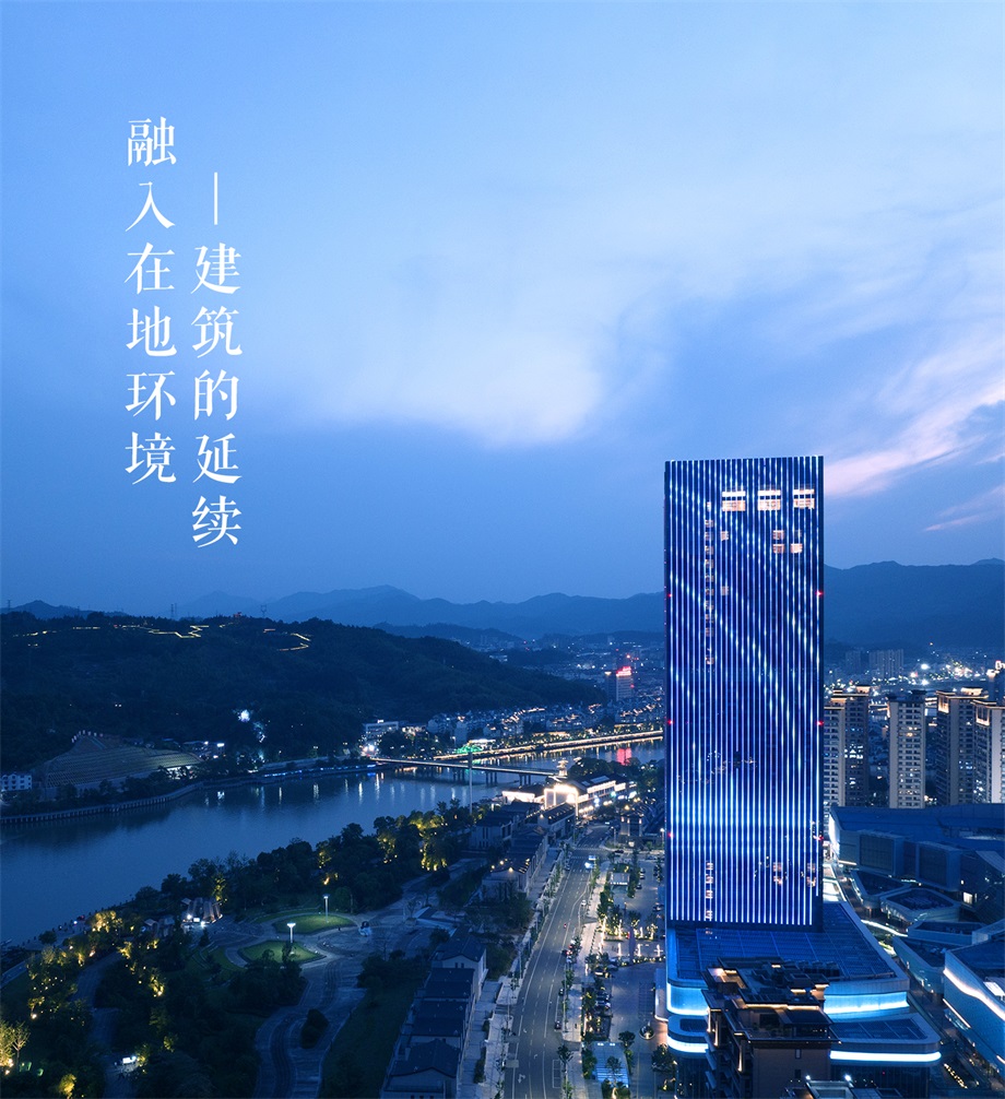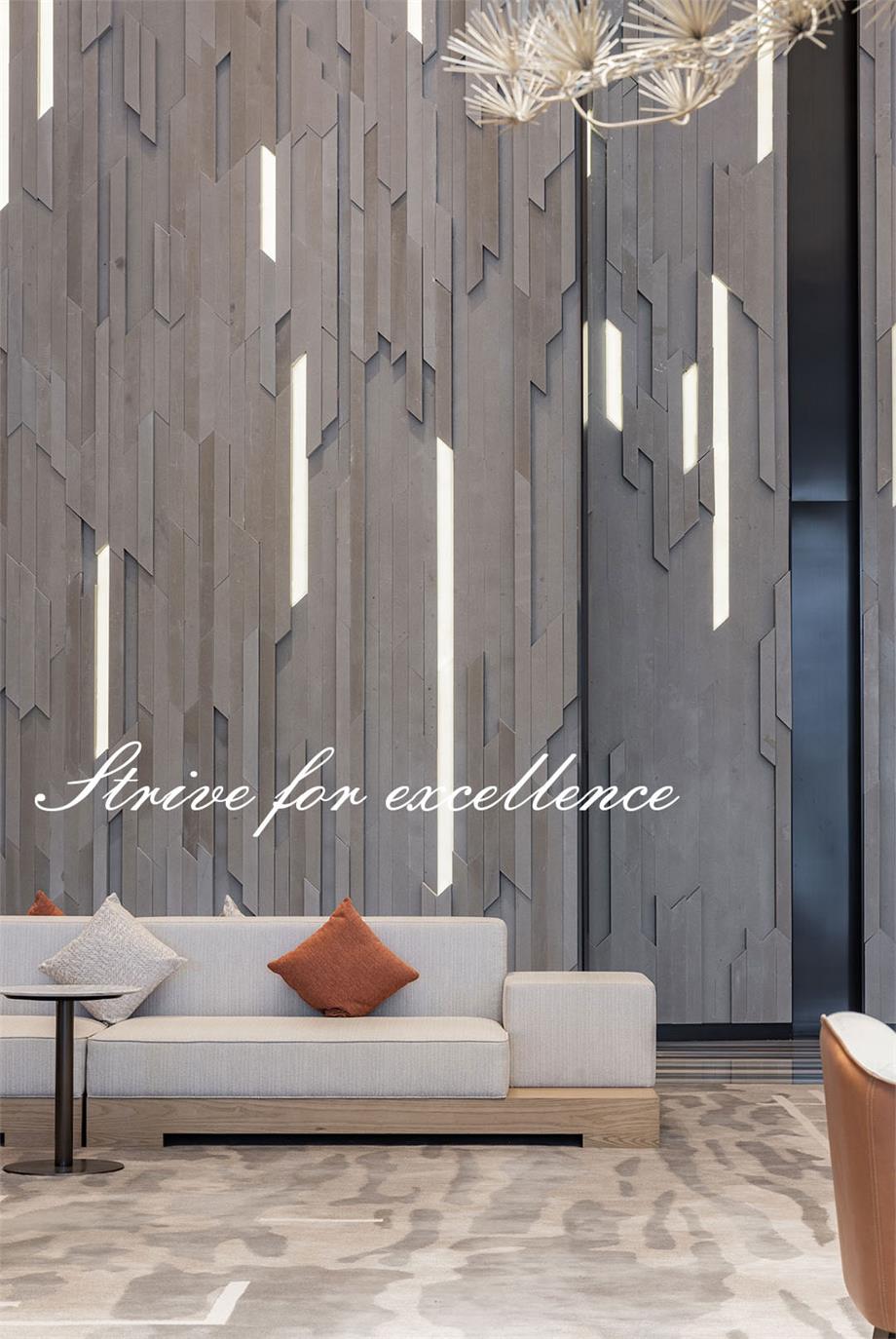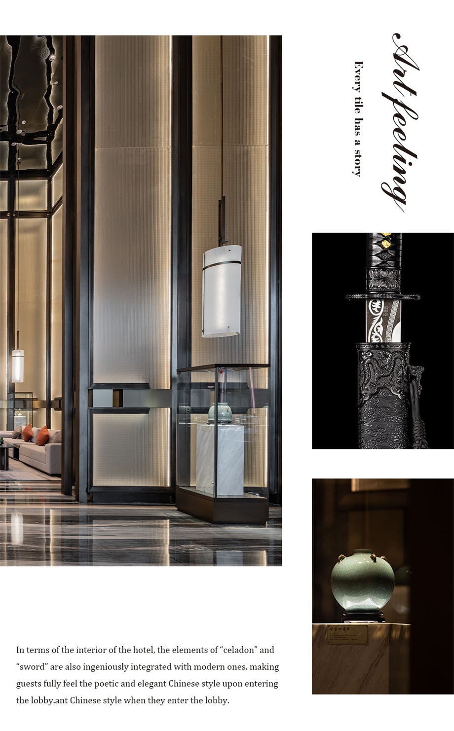 設(shè)計(jì)汲取龍泉哥窯、弟窯文化,將青瓷曲線糅合于建筑線條之中,將冰裂紋元素融于立面肌理,外觀新穎獨(dú)特。在酒店內(nèi)飾上,“青瓷”、“寶劍”元素與現(xiàn)代材質(zhì)同樣做了巧妙的融合,賓客踏入大堂瞬間,即沉浸于龍泉文化的雋永韻味之中。