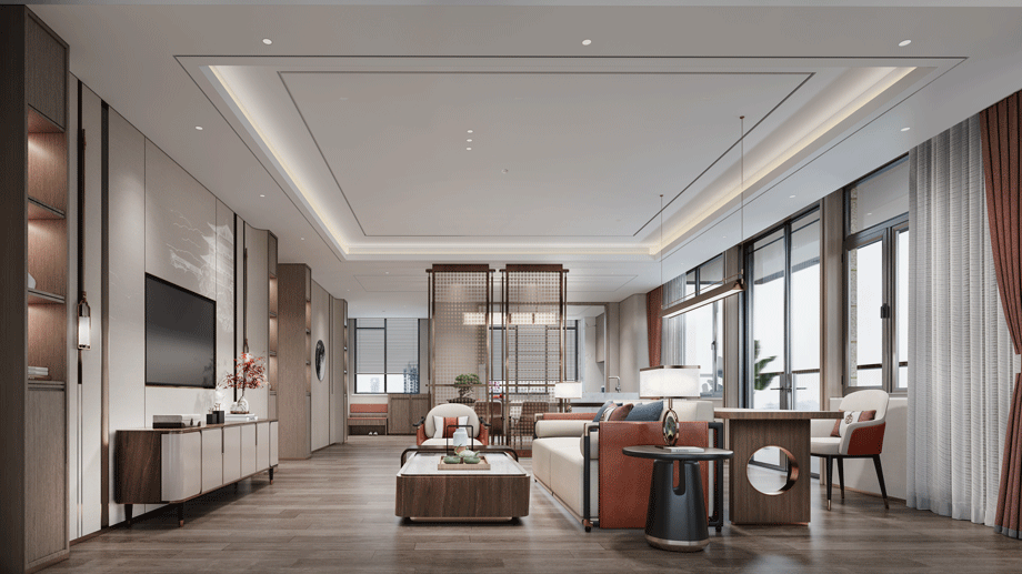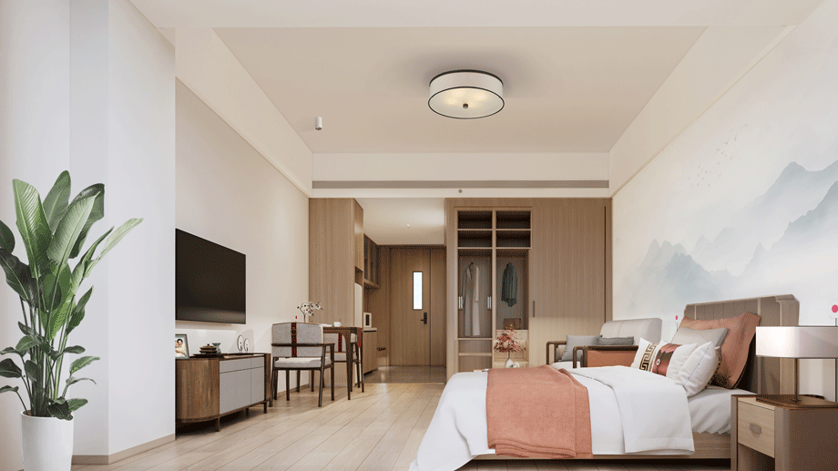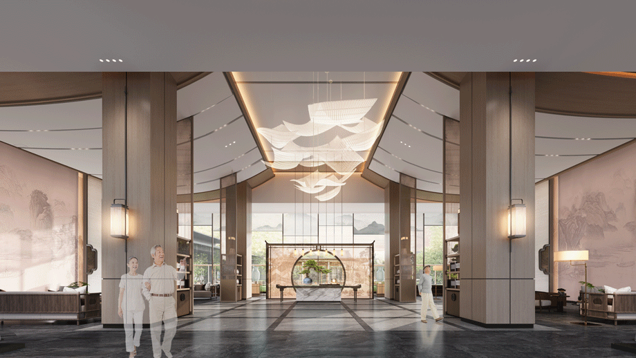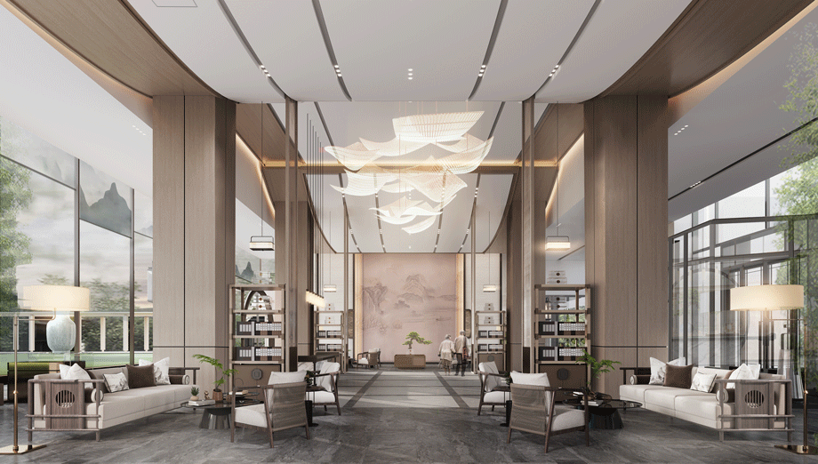 入戶大堂是整體空間的引領者,新中式設計風格,吊頂造型詮釋了主體元素“濟南之山”的形式。打破常規(guī)大堂設計手法,本案營造了酒店會所的氛圍,典雅而高貴,獨特的養(yǎng)老大廳,園中園設計的融入,進一步刻畫了中式風格。