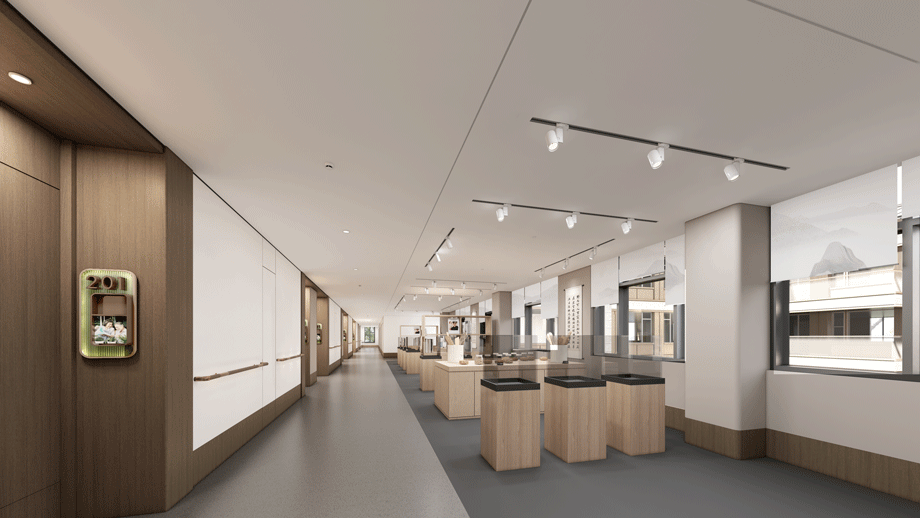 情景式洄游路線。利用走道及多功能餐廳設計可供老年人游走的濟南風情路線,并在路線旁預留休息空間,有助于失智癥老人改善情緒。