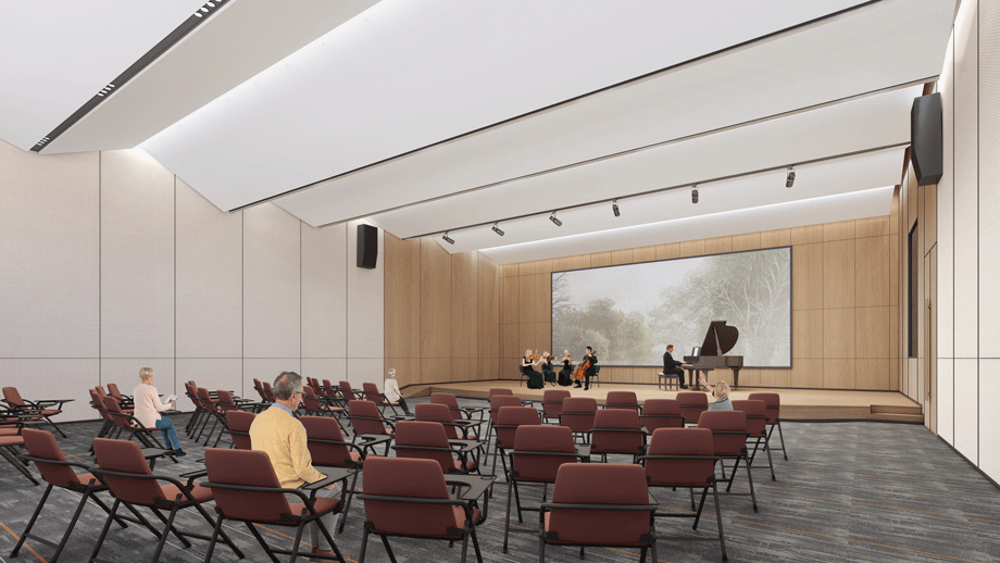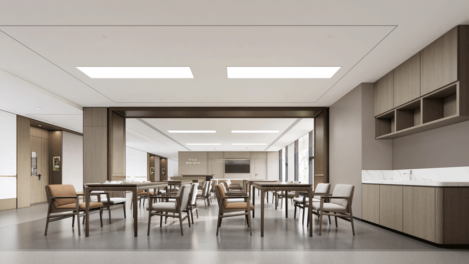 多功能廳延續(xù)了“山”的設計元素,“山”型的吊頂設計,最大化利用結構關系,多種氛圍的燈光設計,滿足不同場景的使用。打造通高空間,光線引入中庭,營造老年人參與的活力度, 滿足老年人心理和感官的需求。