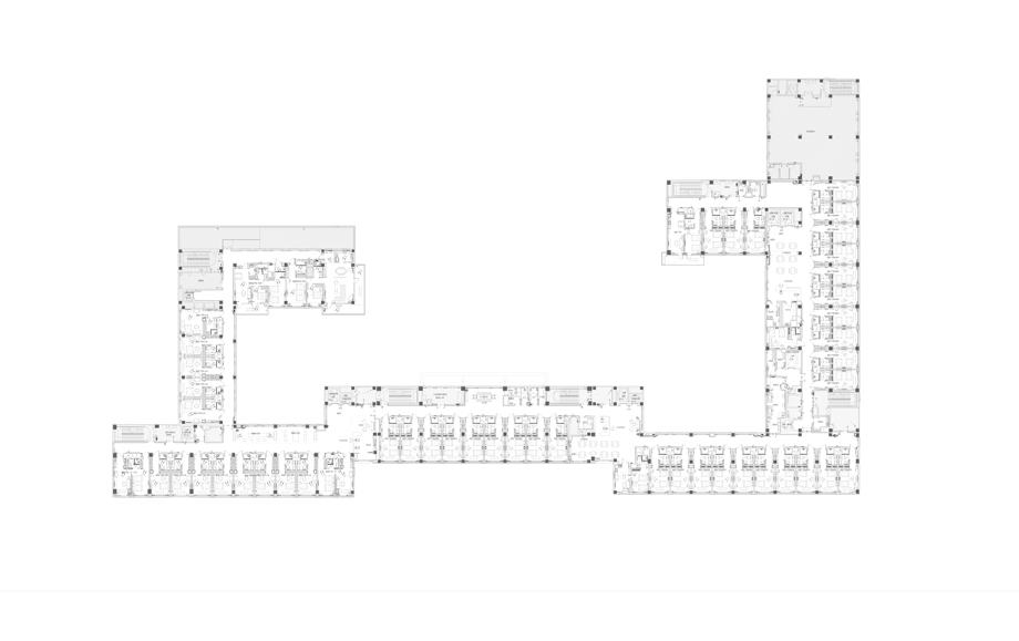標準單元分布在二至六層,每層32床,主要由南向居室、多功能餐廳,北向的護士站、服務用房、交通核組成,根據(jù)醫(yī)養(yǎng)結合需求。