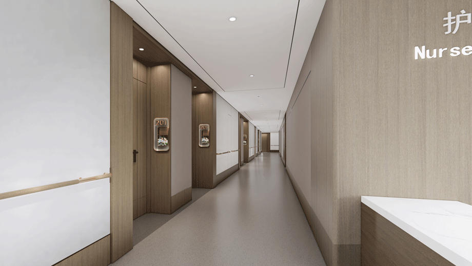 此區(qū)域緊鄰醫(yī)療部分,一方面作為護理區(qū)的等候區(qū)域、另一方面也作為護士站的監(jiān)護視野區(qū)。這是第一個視線通道,來自醫(yī)護與居室外部公共活動區(qū)域的聯(lián)系。