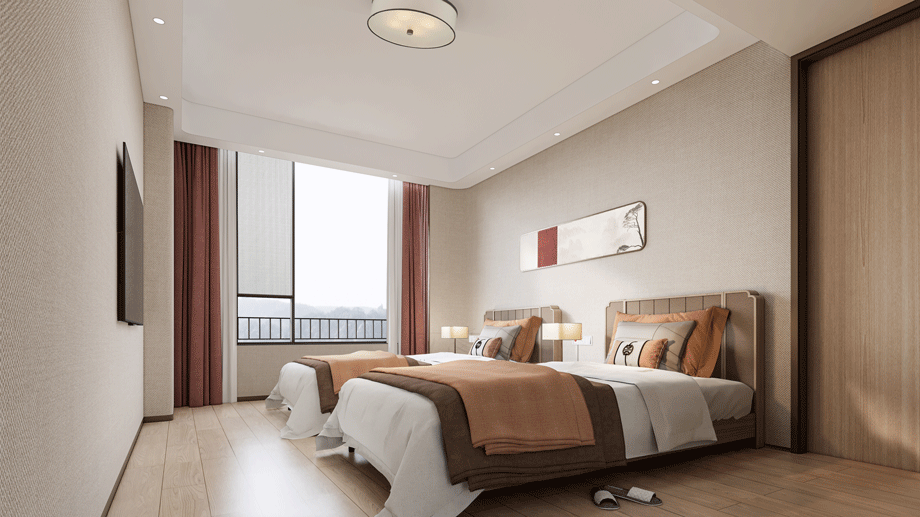 走廊地面鋪設800mm×800mm的防滑地磚,為坐輪椅的老人提供方便。過道兩側距離地面900mm的墻壁上設置扶手,墻面設置一些裝飾畫和注意須知,科普一些必要知識。吊頂下吊200mm,使得視覺上走廊空間擴大,減輕壓抑感。另外,安裝智能化老年公寓環(huán)境監(jiān)測系統(tǒng),及時感知養(yǎng)老中心環(huán)境溫濕度變化,防止意外。