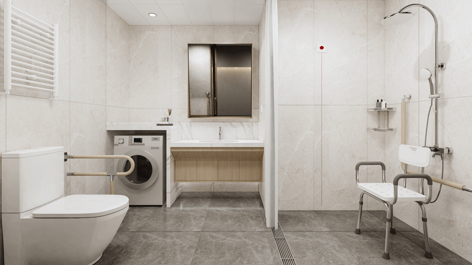 衛(wèi)生間設計中,馬桶兩側皆設置支撐扶手,方便借力;同時在其中留出足夠的空間,滿足無障礙旋轉(zhuǎn)半徑;為了避免狹小的空間使人感到壓抑,衛(wèi)生間墻面貼淺色系墻面磚,給人在心靈上帶來一種放松的感受,在視覺上給人一種空間被放大、通透的感覺。